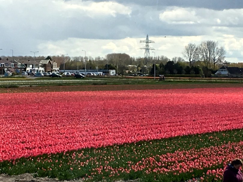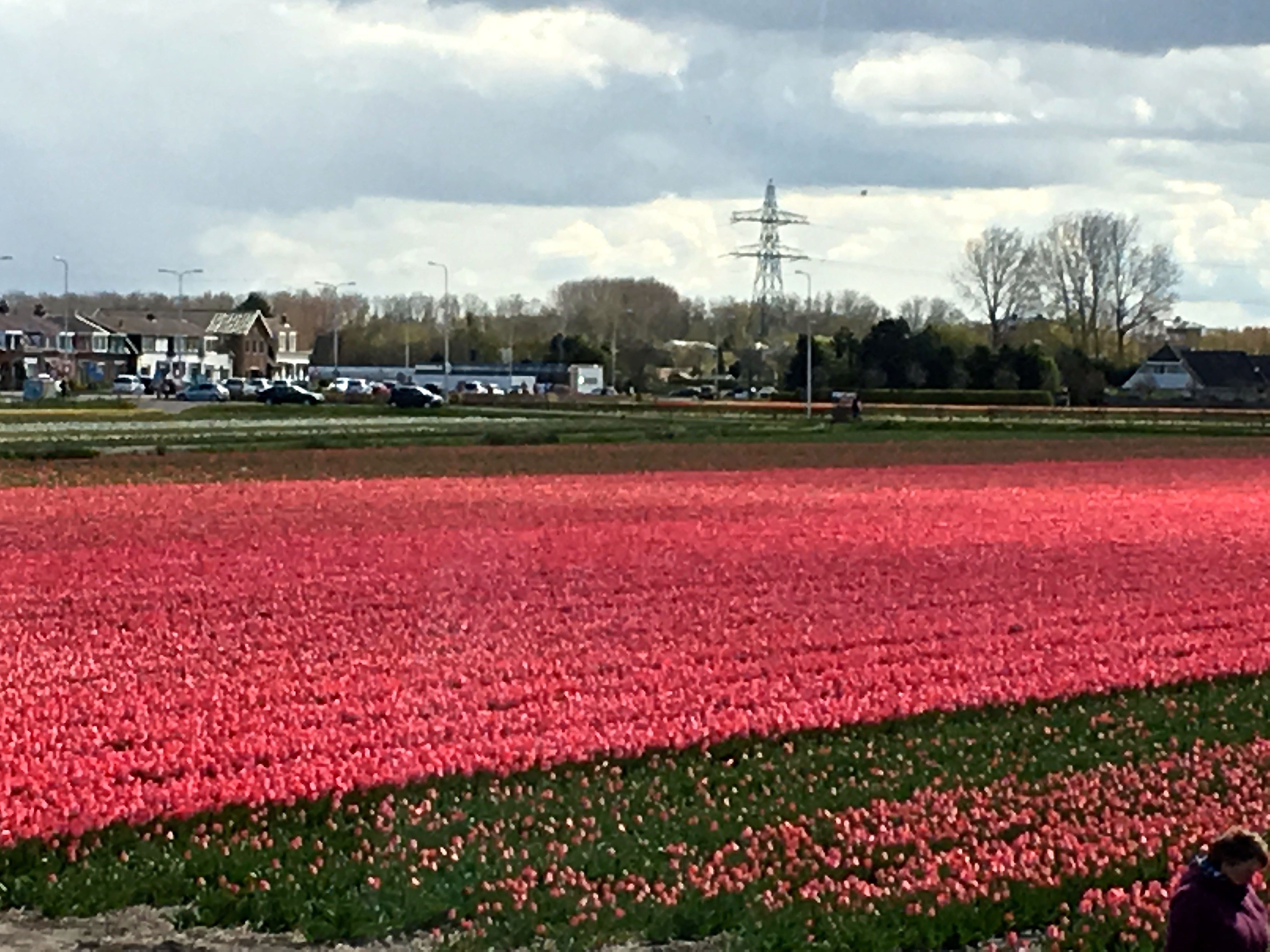 Tulips can be grown from the seeds produced by their blossoms, but it will take years for a tulip started this way to become big enough to flower. (Plus, the seeds of some hybrids are sterile.) Dividing up a bulb is a much faster way to get a mature plant that is ready to blossom for a customer. So for bulb farmers, the goal is to have tulips spend energy feeding bulbs, not sustaining blossoms that attract pollinators to fertilize the plant and stimulate seed production. That’s why a tulip’s head is cut off soon after a blossom is produced. (In other words, farmers direct how the plant will reproduce, favoring bulbs over seeds.) Note the petals lying on the ground to the right of the mature tulips. While machines chop most of the heads, farmers go in by hand afterwards to pluck any that the machine missed.