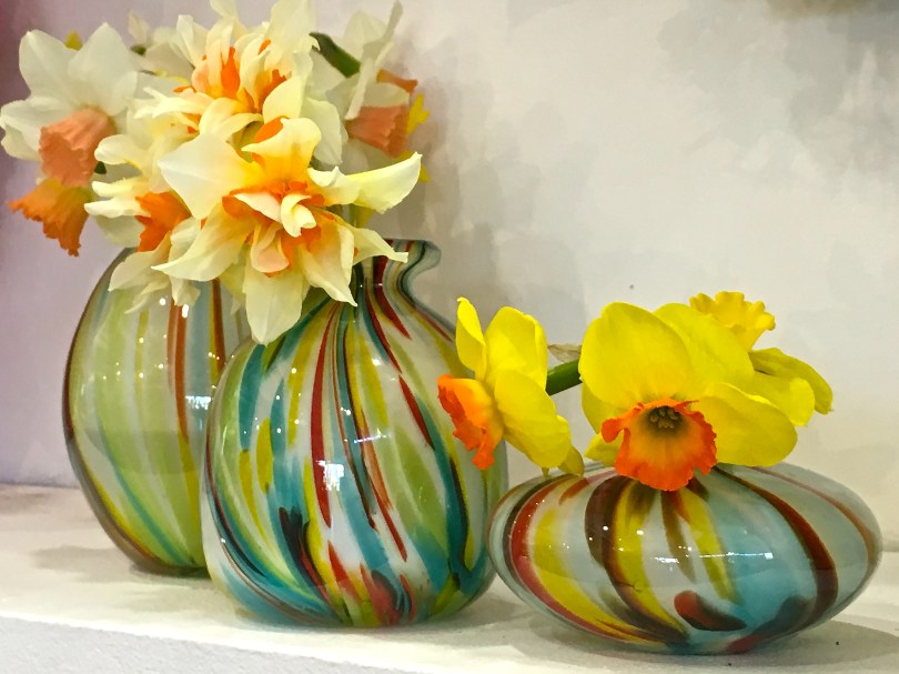 These hand-blown vases perfectly offset the ruffled petals and cheery color of daffodils. Their scientific name “Narcissus” comes from the Greek legend of a young man by the same name, who fell so in love with his own gorgeous reflection while gazing into a river that he tumbled into the water and drowned. The flower was said to have sprung up along the bank where Narcissus sat admiring himself. (Notice that the head of a daffodil is bent downward toward the ground, as if looking for its own reflection.)