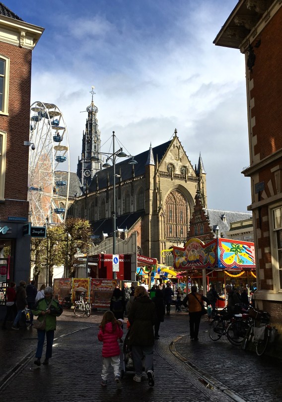 Here, you can see that the Grote Kerk (Great Church) dominates the Grote Markt (Great Market, i.e. Market Square). A funfair fills the marketplace in honor of the flower festival. This square has been the center of Haarlem’s community events for more than 700 years. If you look at Dutch Master paintings of it, you’ll see it hasn’t changed much (except for the Ferris wheel and modern rides, of course.)