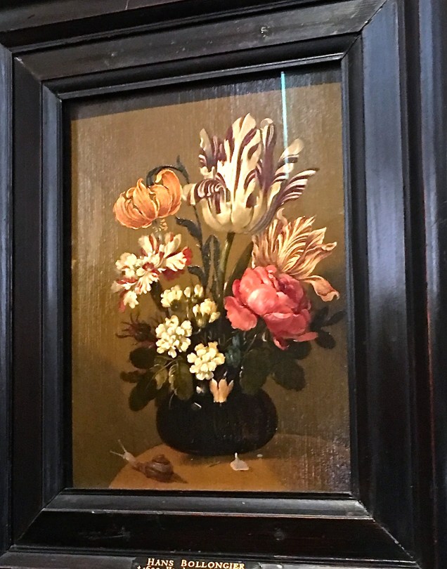 I’ll admit I’ve never been a big fan of floral still-life paintings. … until I saw several at the Frans Hals Museum and purchased a book about the genre. If you look closely at this painting by Hans Gillisz Bollongier, you’ll see tiny details like bugs, snails, and fallen petals. Not only do these act like botanical illustrations by documenting species, but they also imply the brevity of life and the wish that time would pass more slowly so we could enjoy the bouquet longer. The images usually also contain flowers that would have never bloomed in the same season, such as the lily and tulip, so it’s a bit like a fantasy bouquet. The top flower is always the priciest; here, it’s the “Semper Augustus” tulip, which could cost as much as a house.