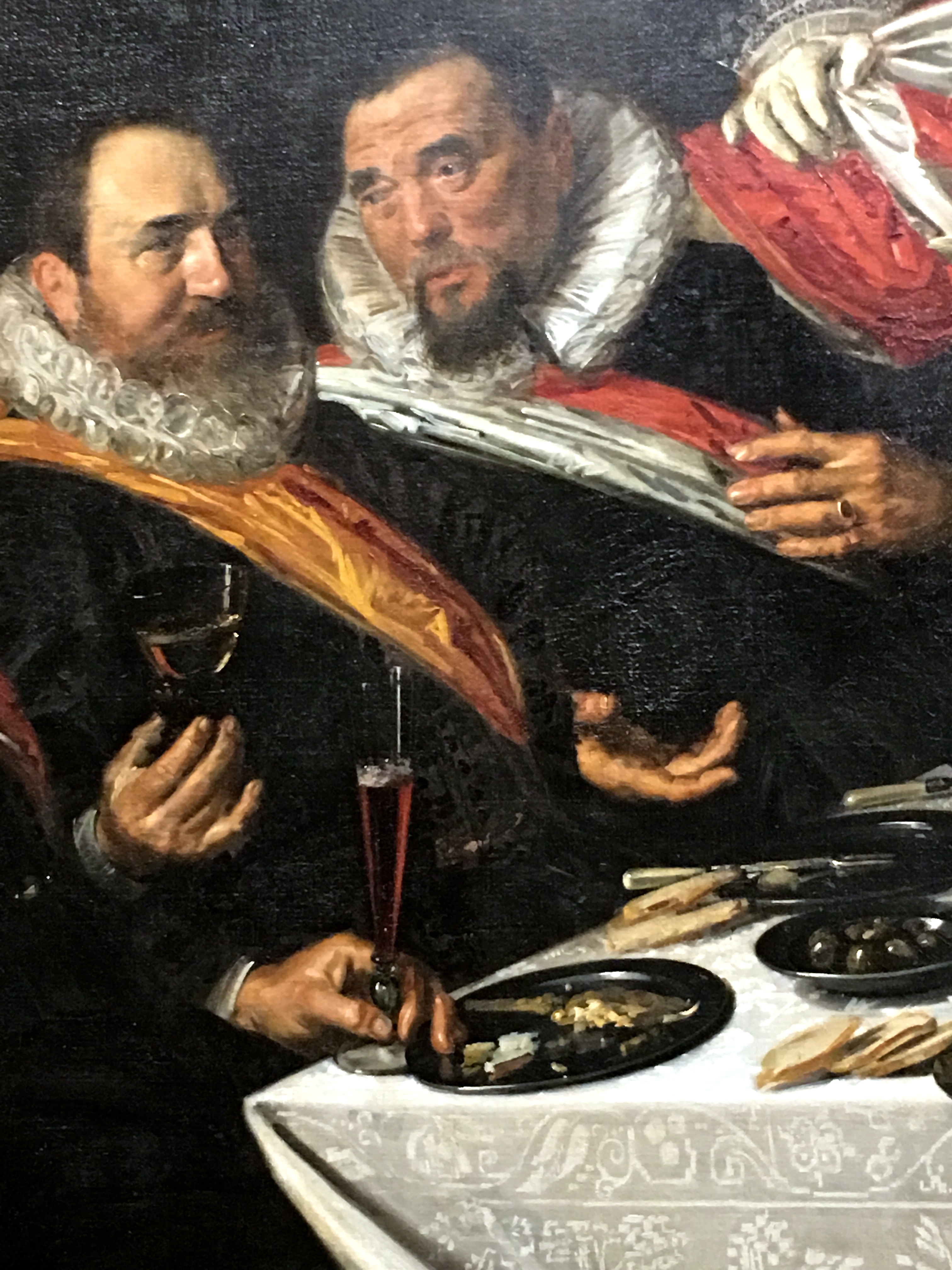 Check out the impressionistic, almost sloppy brushwork on the ruffs, neckcloths, and sashes of these men. If it weren’t for Hals’ ability to capture their rather drink-addled and dissipated expressions, we might think he’d joined them in several toasts while painting their portrait. (Hals was himself a member of the Guards.)