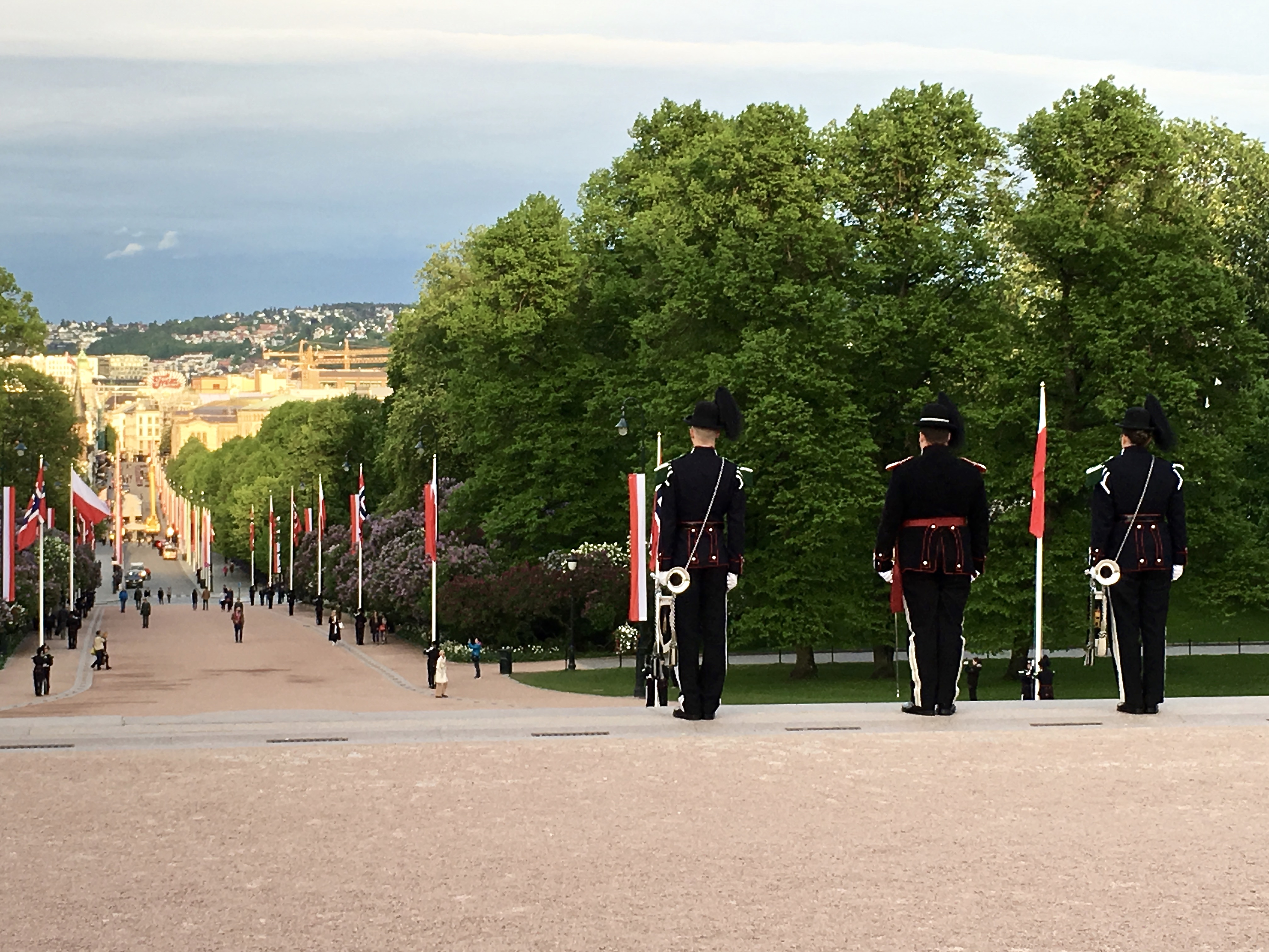 IMG_1326 July 28, 2016 4032 × 3024 Norway’s National Day 2016 The guards line up, two by two, next to each flagpole, all the way down the palace grounds to Karl Johans Gate.