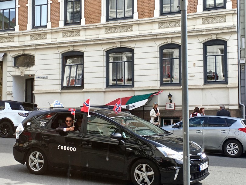 IMG_3250 August 11, 2016 4032 × 3024 Norway’s National Day 2016 Taxis get in on the action by flying the Norwegian flag.
