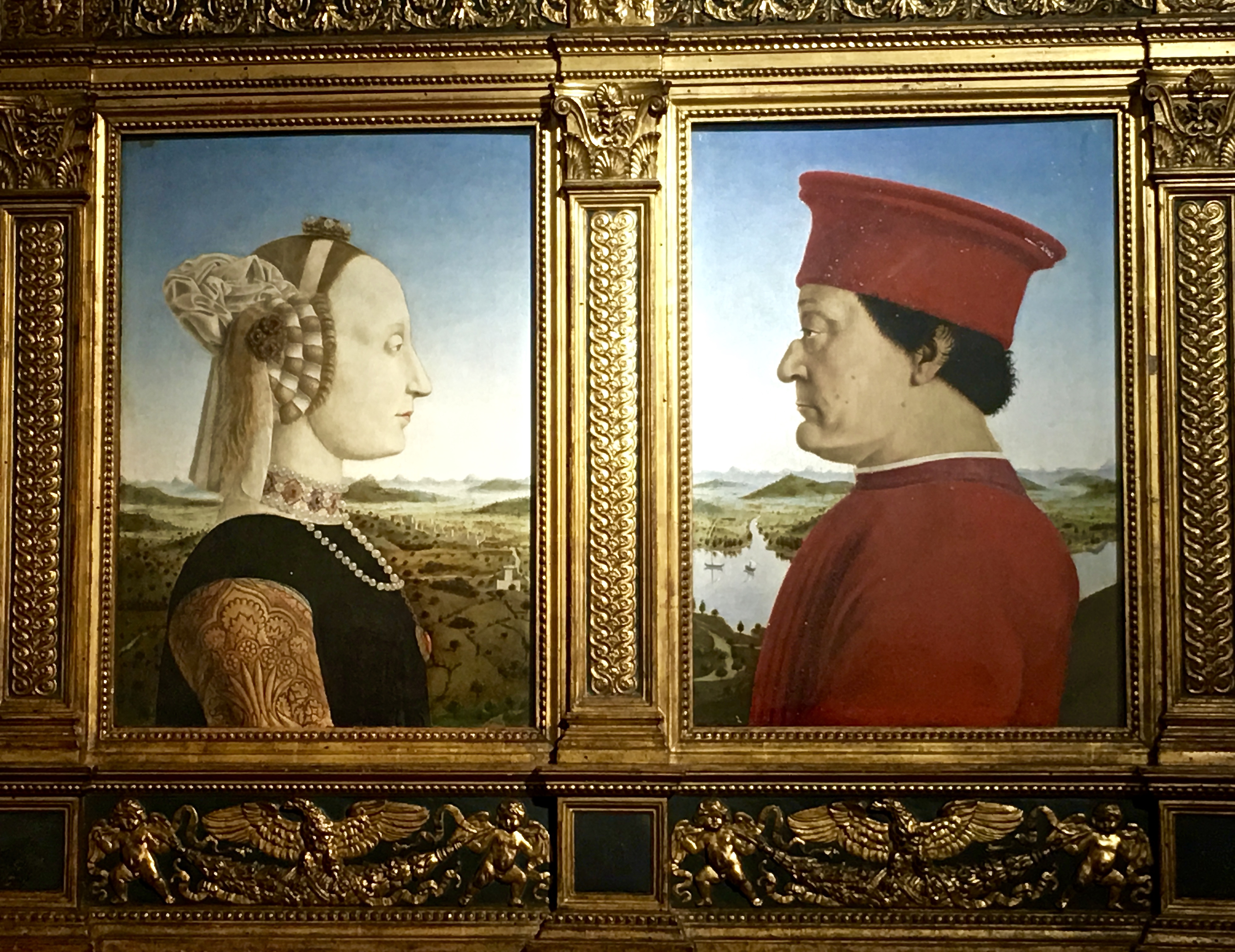 Piero della Francesca, geometrician and master of perspective, painted this pair of portraits. They depict the Duke and Duchess of Urbino — he’s one of the leaders who inspired Machiavelli’s work, Il Principe. The Duke is always portrayed on his “good side;” he had acquired a huge scar and lost an eye in a tournament. Possessing only one eye hampered the Duke’s aim, so he had surgeons carve away the bridge of his nose to improve his field of vision. His wife, who he described as “the delight of my public and private hours,” died at age 25 after the birth of their seventh child. Considered a beauty, she had bleached hair and a plucked hairline to raise her forehead. Her white skin reflects the fact that the portrait was done post mortem.