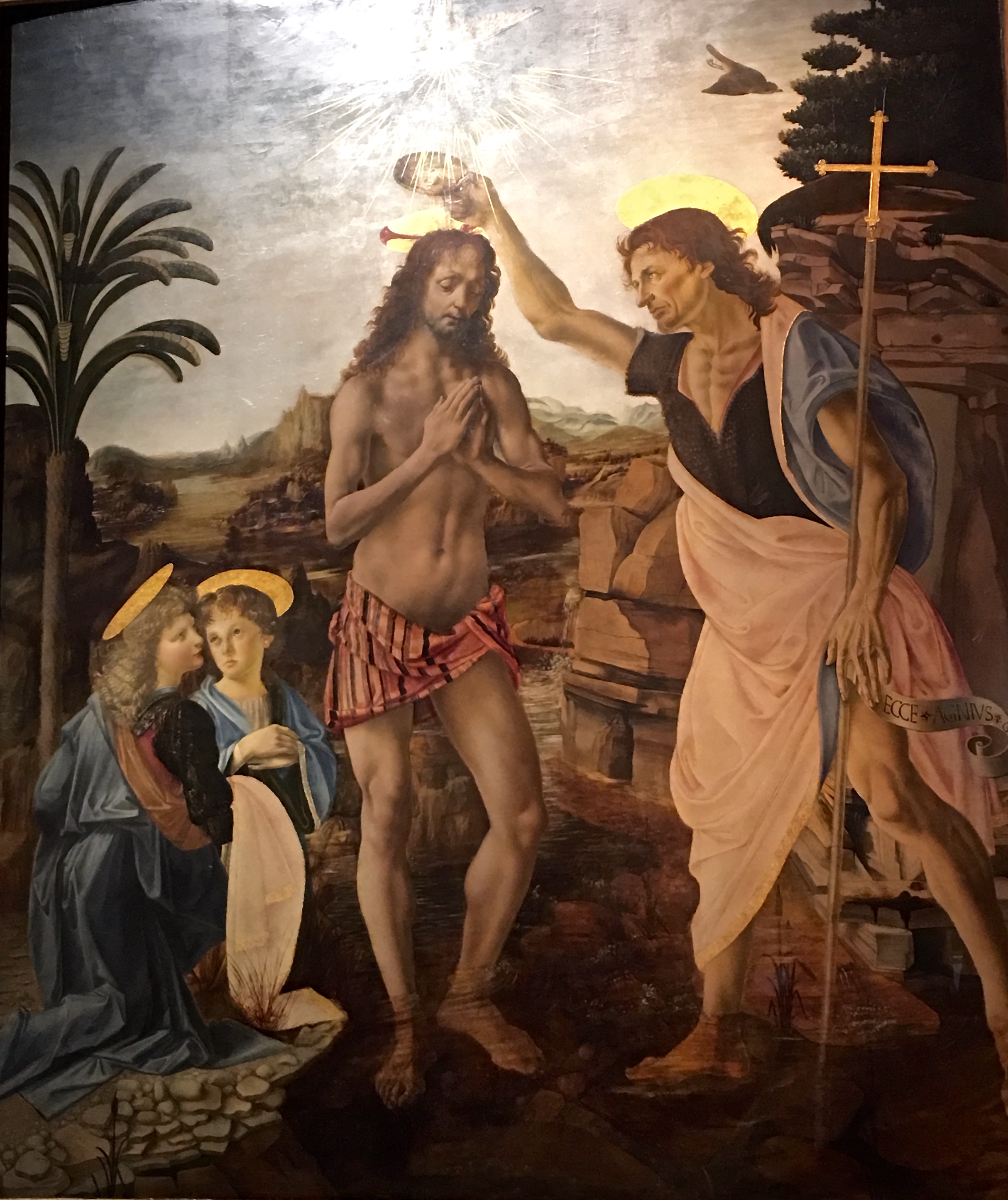 The “Baptism of Christ” is considered Leonardo da Vinci’s earliest work. He didn’t paint the whole thing; just the angel holding Jesus’s robe, plus a bit of the landscape. Leonardo’s mentor Verrocchio is responsible for much of the scene, but when he saw how well his apprentice had captured the angel, it’s said he put down his brush and never painted again. In truth, the Baptism is Verrocchio’s last-known painting, but he said himself that he far preferred sculpting to painting, so he was probably glad to have someone else to take on these kinds of commissions.