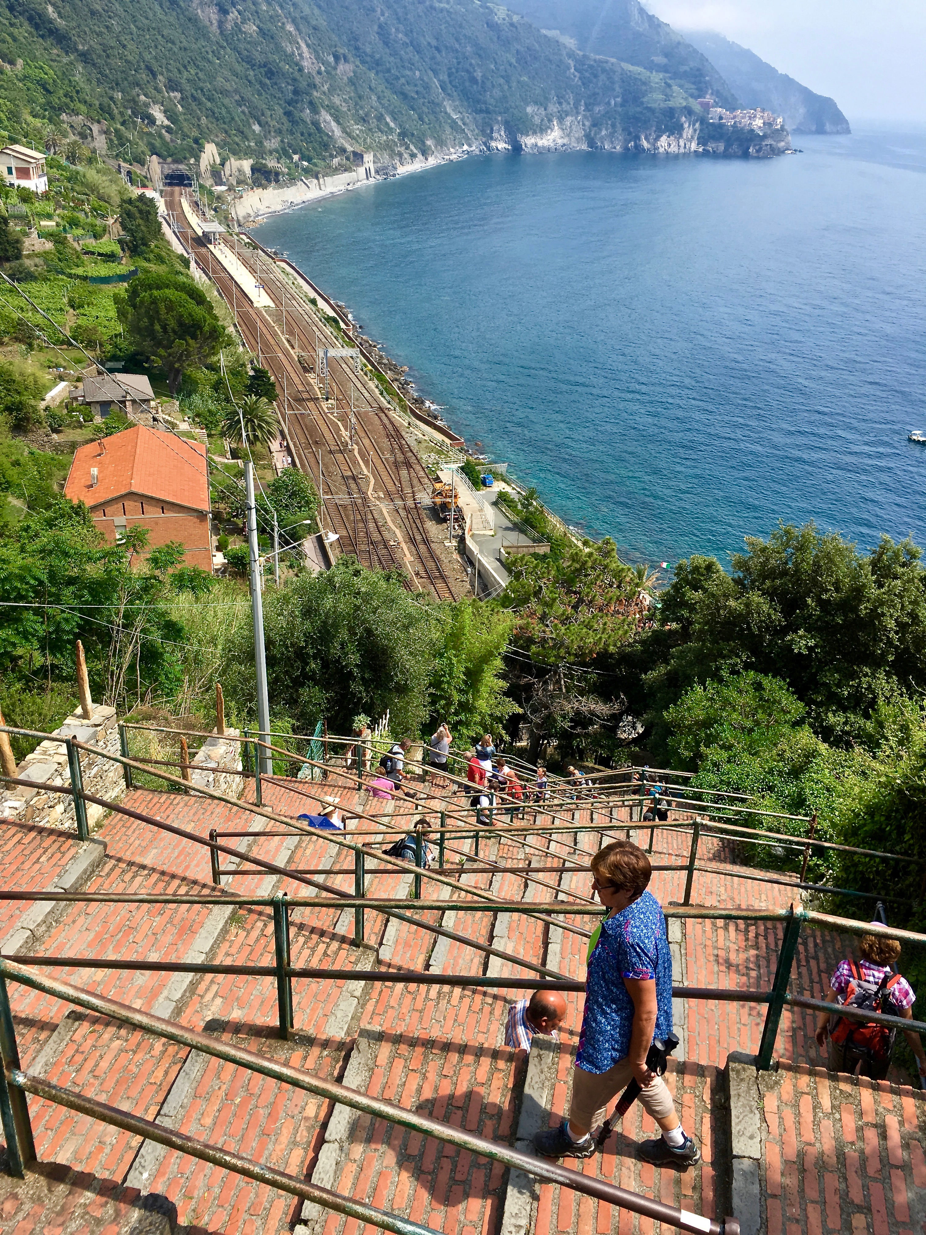 IMG_1887 August 20, 2016 3024 × 4032 Italy: Trekking the Cinque Terre Check out the stairway to the train platform. Called the ‘Lardarina,” it consists of 33 flights totaling 377 steps. So glad we decided not to hike in the opposite direction, or we would’ve had to climb up these stairs, rather than march down them.