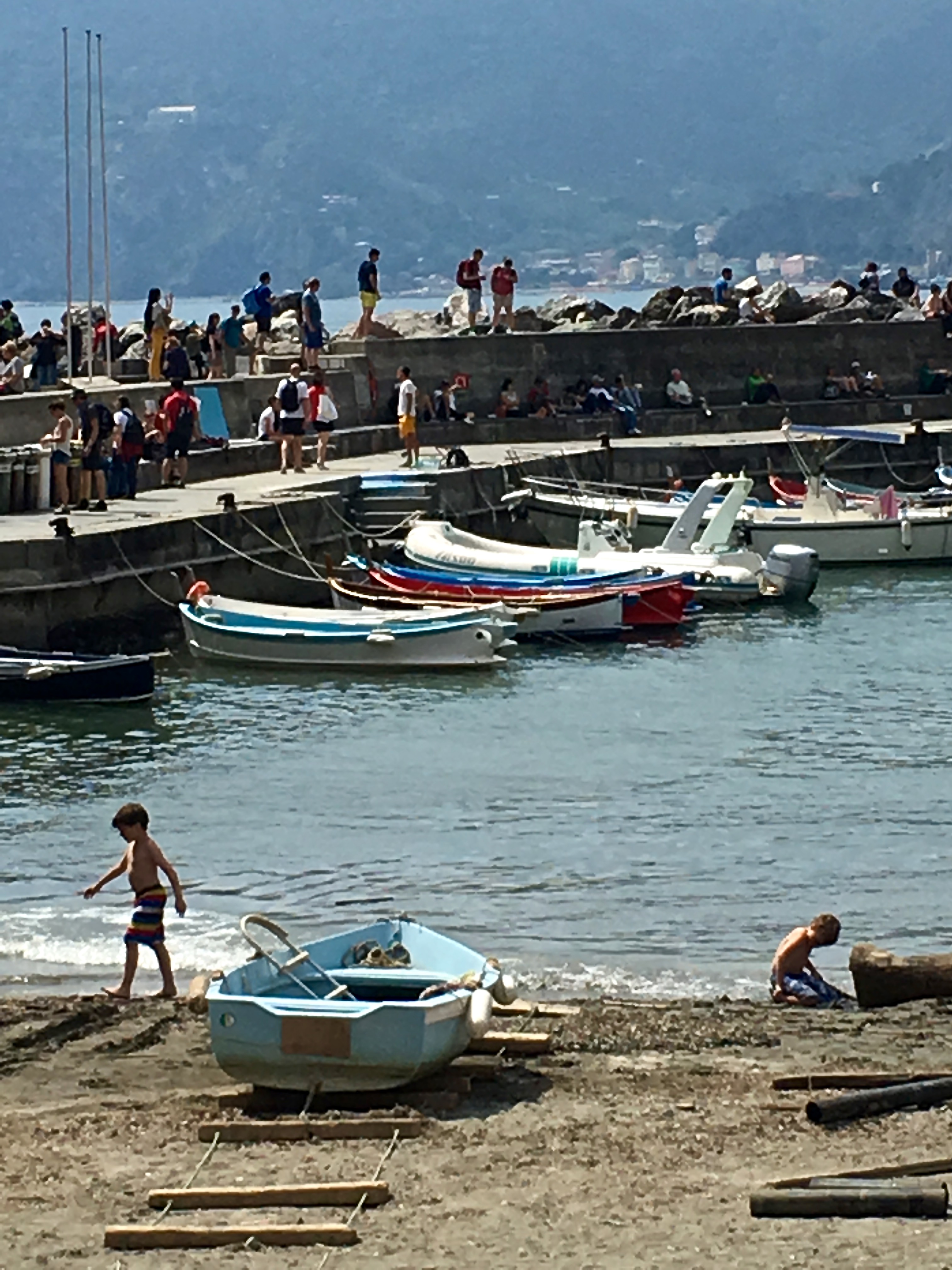 A breakwater protects Vernazza’s natural harbor and a tiny stretch of sand that acts as a boat launch and kiddie play pool. But during winter, the sea can be so rough that waves can come crashing over the breakwater, flooding the harbor area and carrying away unsuspecting bystanders.