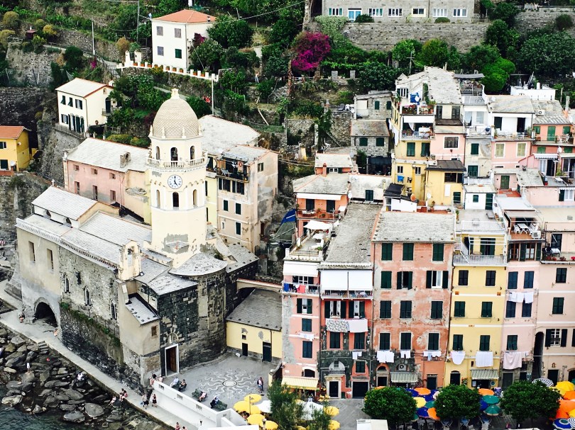 Built in 1318 and enlarged in the 16th century, Vernazza’s simple Ligurian Gothic church is characteristically made of black stone hauled from the top of the mountain above. The church has a bit of an awkward entrance — as we learned when we accidentally popped in during the middle of a service and found ourselves next to the altar, facing the congregation.