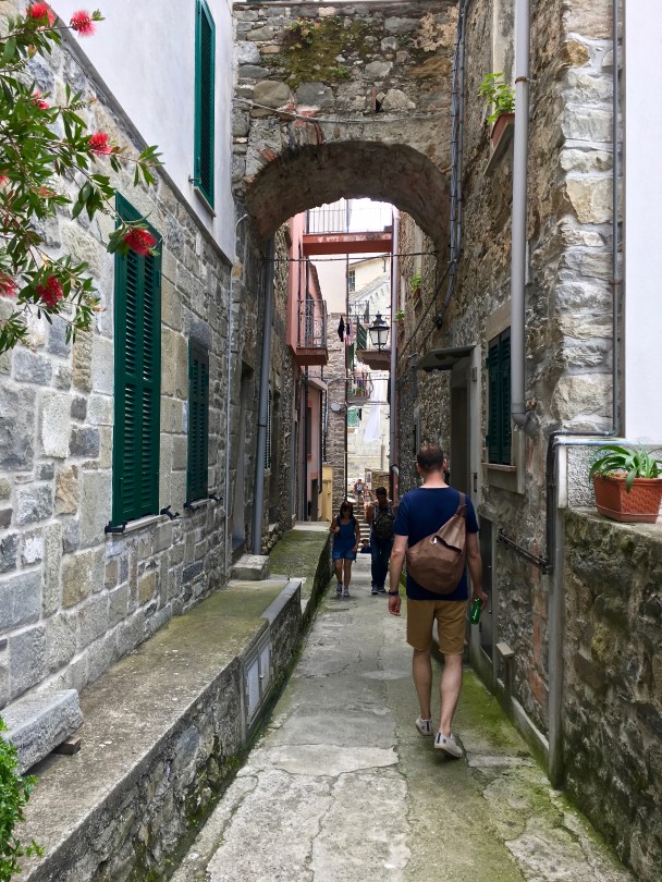 IMG_5184 August 21, 2016 3024 × 4032 Italy: Trekking the Cinque Terre Evocative narrow alleyways snake between towering houses, the walls of which are supported via arches spanning the narrow lanes.