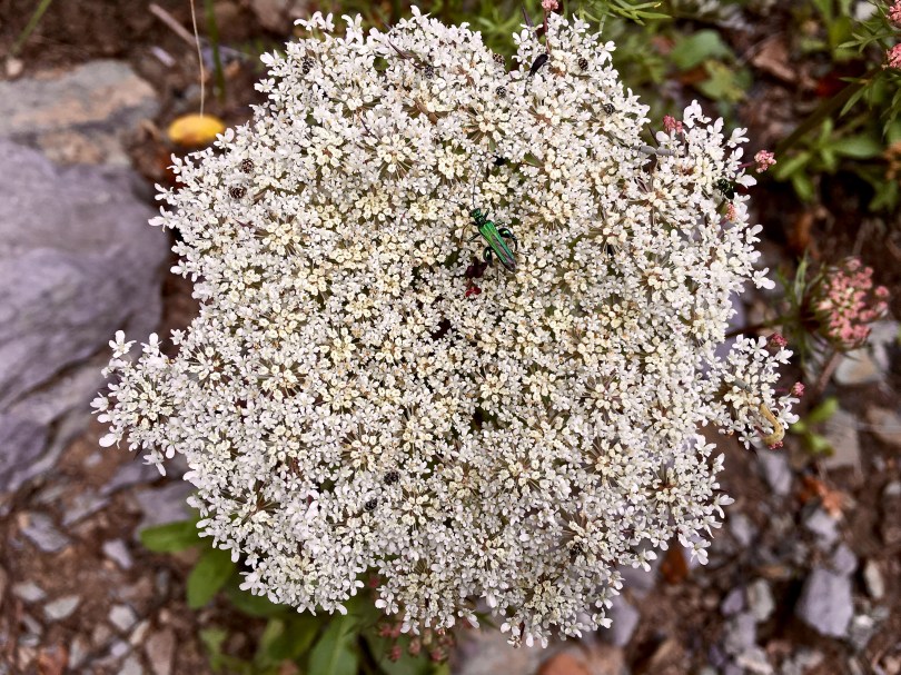 IMG_5376 August 22, 2016 4032 × 3024 Italy: Trekking the Cinque Terre An irridescent Musk Beetle (Aromia moschata) forages on wild carrot (Queen Anne’s lace / Daucus carota) growing along the trail.