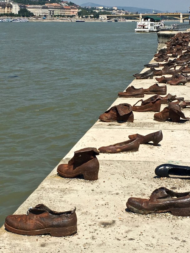 A row of 50 bronze shoes commemorates Hungarian Jews who were massacred during the WWII Holocaust. To save on bullets, Nazi collaborators tied several Jews together, but shot only the first few in the lineup — so that as they fell dead into the river, they dragged the others in behind them. Around 600,000 of Hungary’s Jews lost their lives during the war.