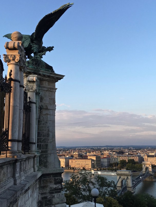 A sculpture of the legendary Turul bird overlooks Pest from the grounds of the Royal Palace in Buda. As the story goes, the Turul led the Magyars from Central Asia during the ninth century. The bird supposedly carried a sword in his talons, which he dropped in the Carpathian Basin as a sign that this is where the Magyars should settle.