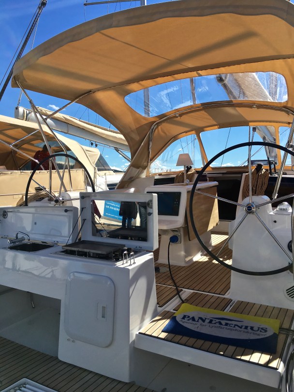 The Xc 38 comes with a futuristic Navistation and chart table, plus two wheels to steer the rudder. I found out that two wheels are pretty standard on racing yachts nowadays. That’s because, when you’re “hard into the wind” (meaning when you’re at top speed and the wind causes the boat to lean heavily to one side), you can use the wheel that’s on the highest side. This lets you sit higher up so that you can see the jib sail in front. Plus it also allows you to counterbalance the lean of the boat with your weight.