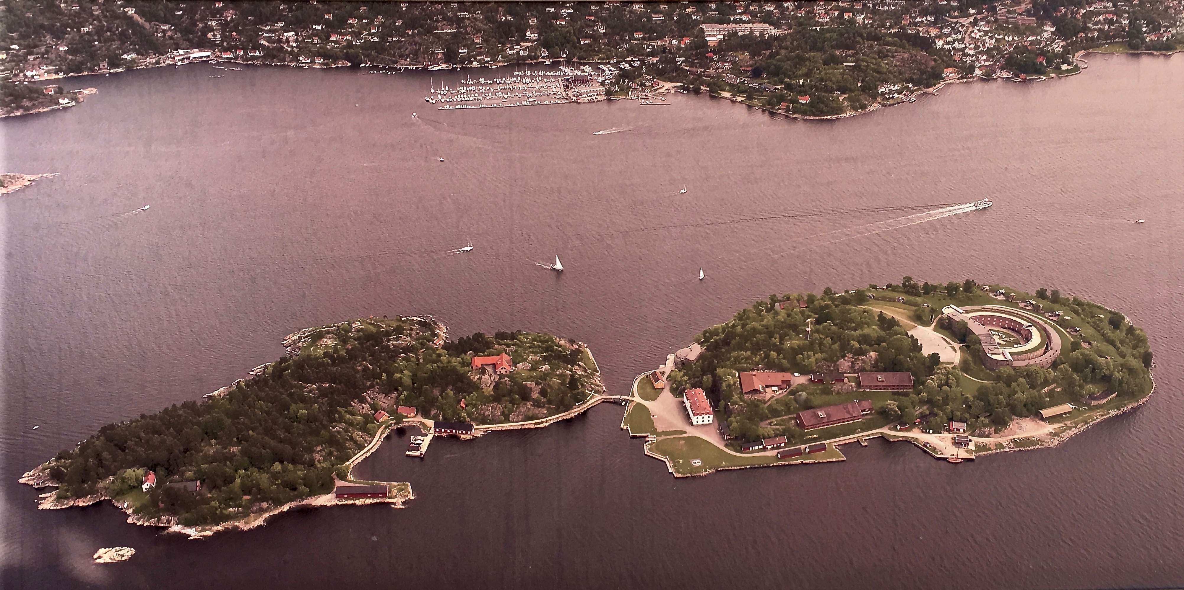 img_7306 December 5, 2016 4007 × 1999 Oscarsborg Fortress An aerial photo shows the horshoe-shaped fort on South Kaholmen island, which is connected to North Kaholmen via a tiny stone causeway.