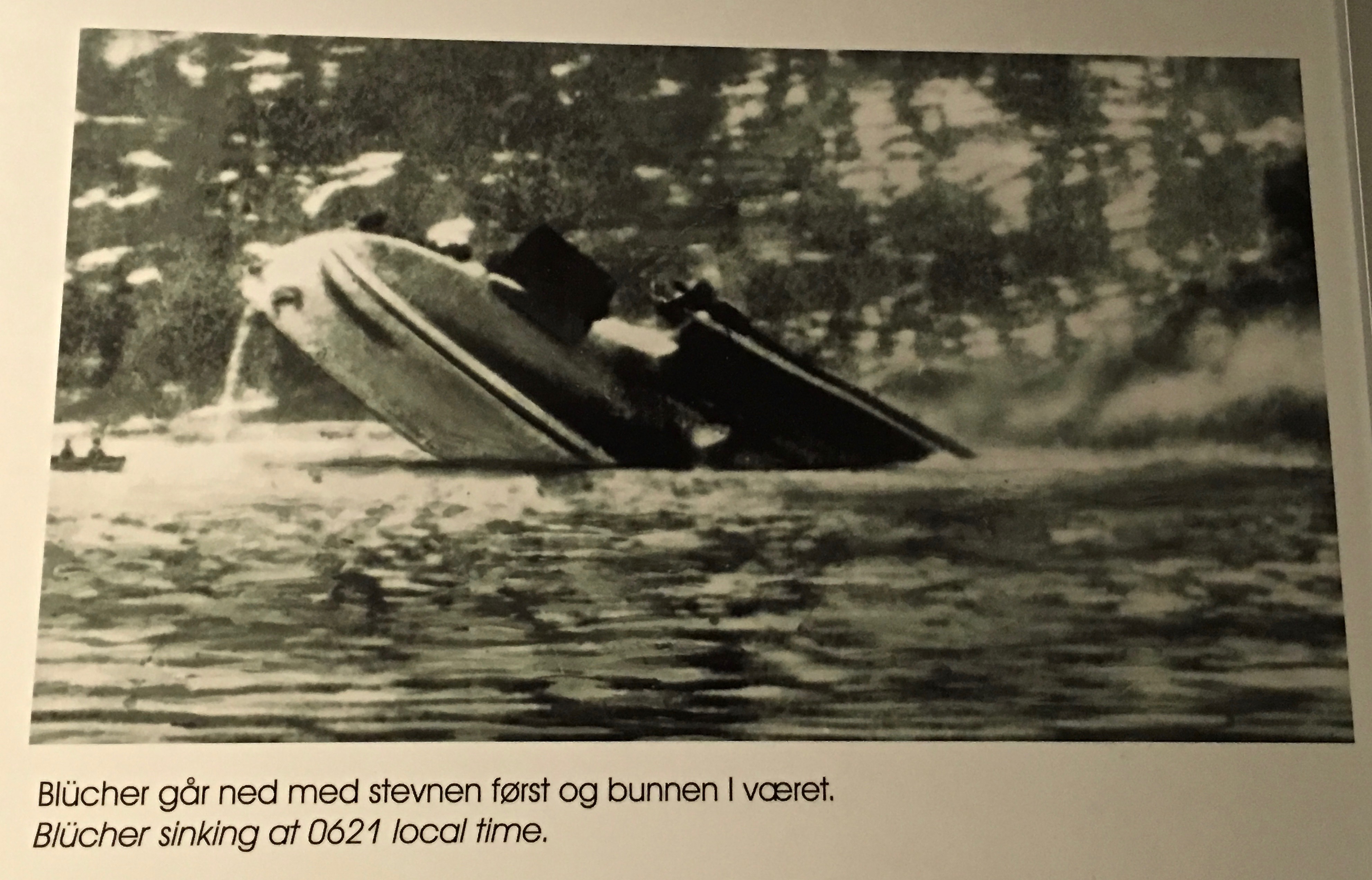 img_7333 December 7, 2016 3965 × 2544 Oscarsborg Fortress By 6:21 a.m., the Blücher goes keel up, and sailors and soldiers abandon ship. Most of those who don’t drown in the freezing waters end up being burned alive when oil spilling out from the sinking ship catches on fire.