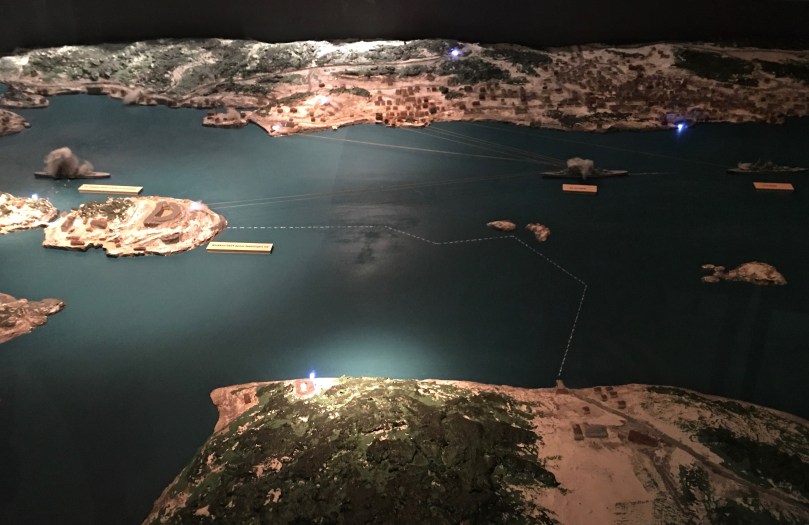 A diorama shows the progression of the Battle of Drøbak Sound. (Click for a bigger view.) You can see the two guns targeting the Blücher at the head of the flotilla. The next ship in line, over time. We can see the Lützow, took a hit from a shore gun. On the far left, you can see the two torpedoes targeting the Blücher as she drifted close to North Kaholmen.