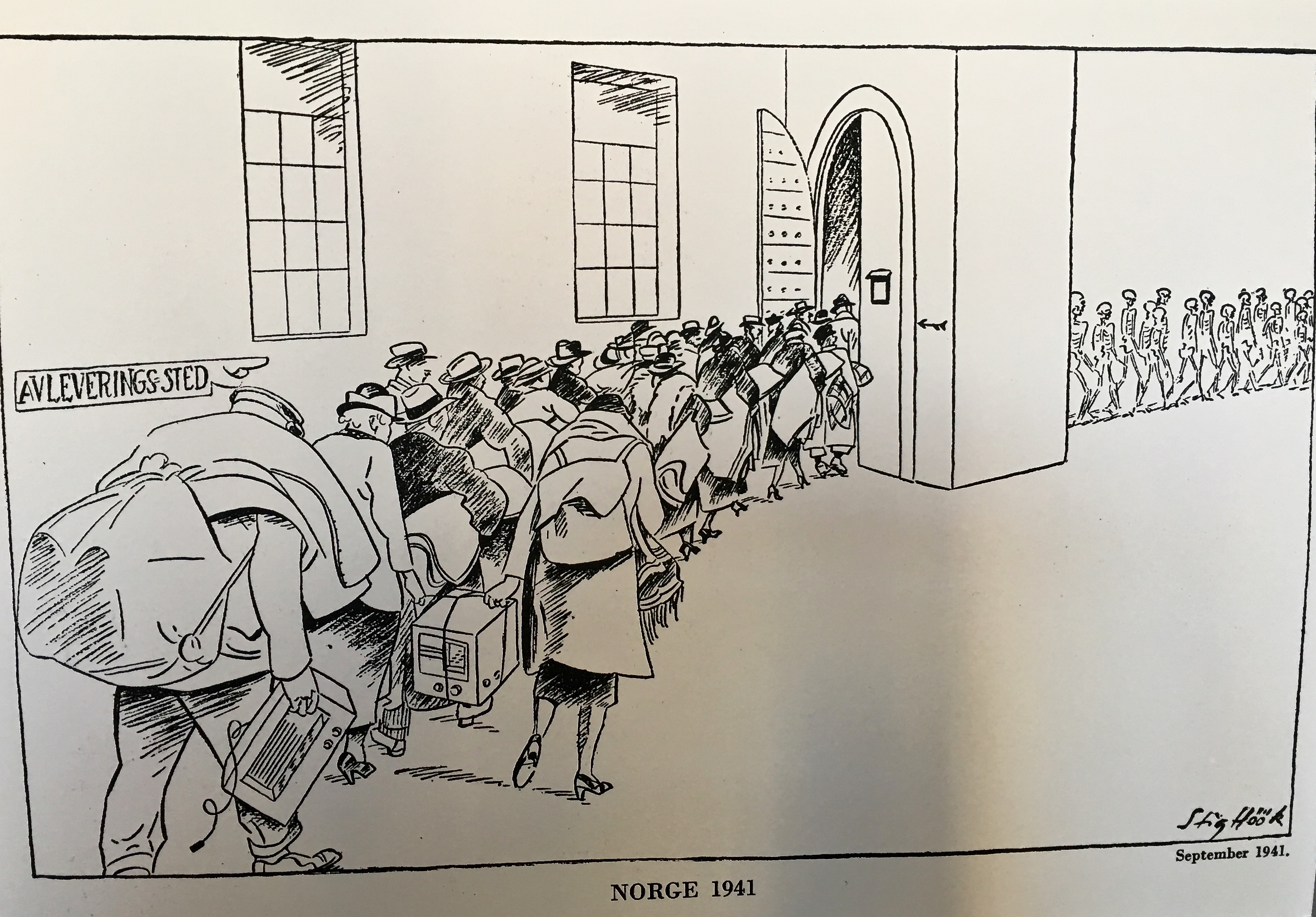 While we were visiting, the Commandant’s House had a special exhibition on the work of Ragnvald Blix (Stig Hook). He was a caricaturist famed for his biting political cartoons during WWII. This one shows Norwegians taking their radios and other forbidden communication devices to a Nazi “Delivery Place.”