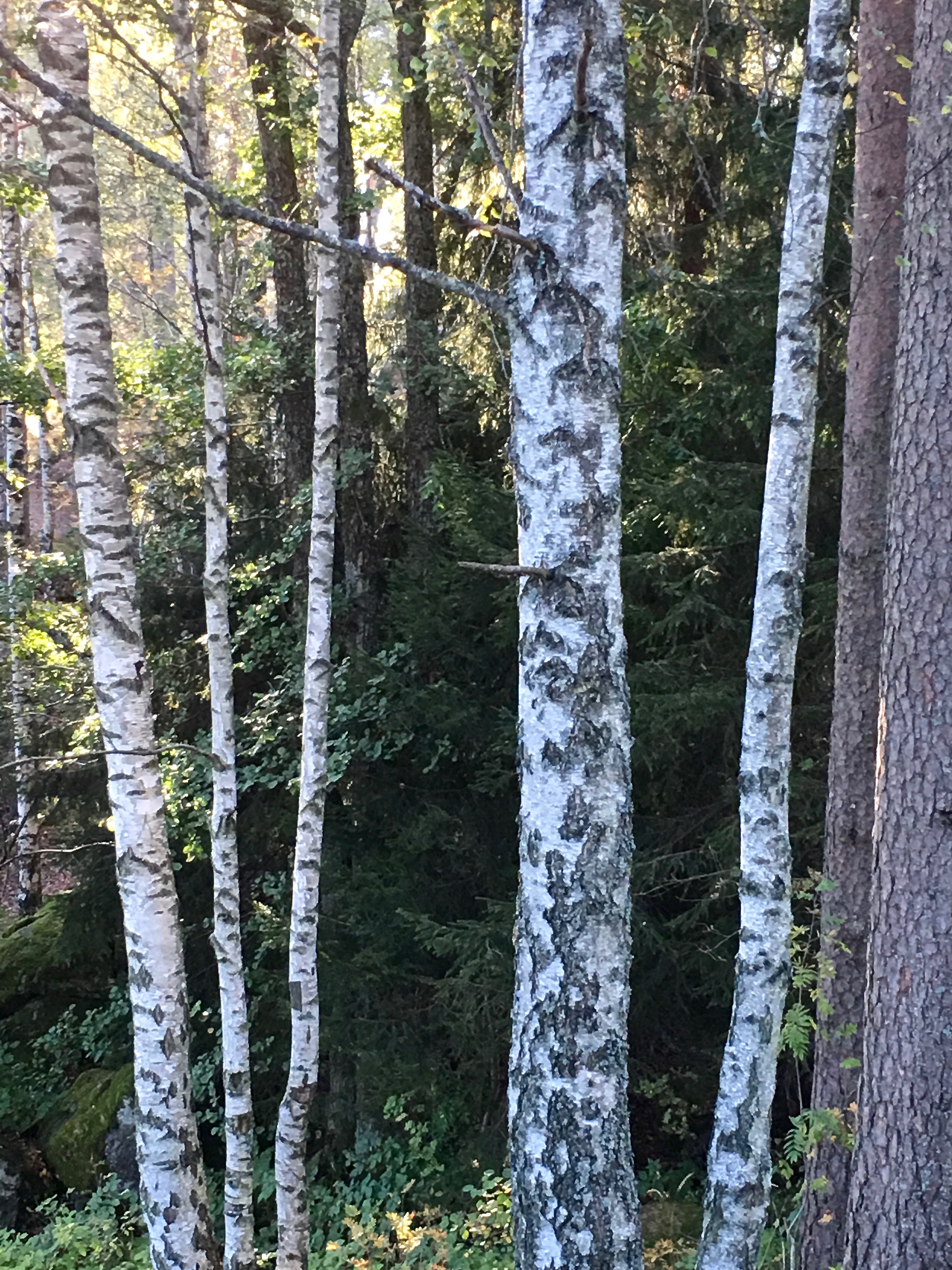 Along the trails at Sarabråten, informative labels help identify tree species. The birches on the left sport the smooth, horizontally striped bark of the Dunbjørk (Betula pubescens). In English we call it a White Birch or Moor Birch. The blotchy trunks on the right belong to the Hengebjørk (Betula verrucosa), or Hanging Birch, so called because the new growth at the end of its branches droops downward.