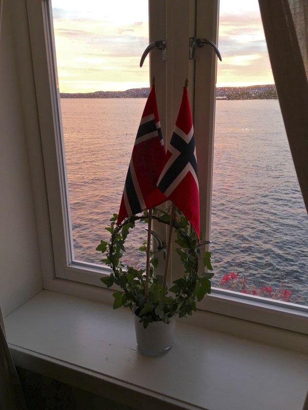 Another peaceful view, this one is adorned with the requisite Norwegian flags and a living ivy wreath. Such wreaths seems to be a popular window dressing in many Norwegian homes. I got one myself recently, but I haven’t figured out how to keep the spider mites off of it.