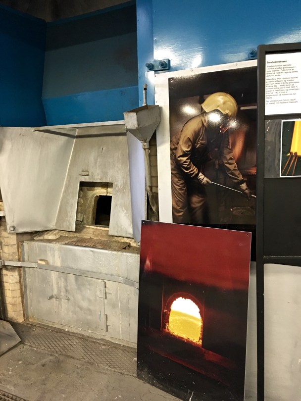 Each year, Hadeland melts about 25 tonnes (27.5 tons) of raw materials to make glass. Every afternoon, workers load the raw materials into special pots that get placed into a furnace and heated to around 1400° C (2552° F), until the glass is white hot. By morning, when the glass has reached the consistency of honey, the temperature is reduced to 1140° C (2084° F) — the ideal temp for blowing glass.