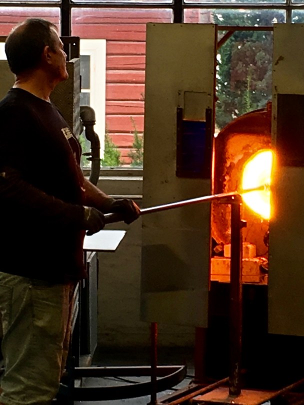 Glass that has cooled to the correct orange-red stage for blowing gets placed into a smaller oven called the “Glory Hole.” The glassblower first heats the end of the blowpipe, then dips it into the molten puddle of glass to collect a blob called a “gather.” He then rolls the gather of glass on a steel plate called a “marver” (notice the slab of metal beneath his hands.) The process of “marvering” forms a cooled skin on the exterior surface of the glass so that it will more easily hold its shape as the glassblower works with it.