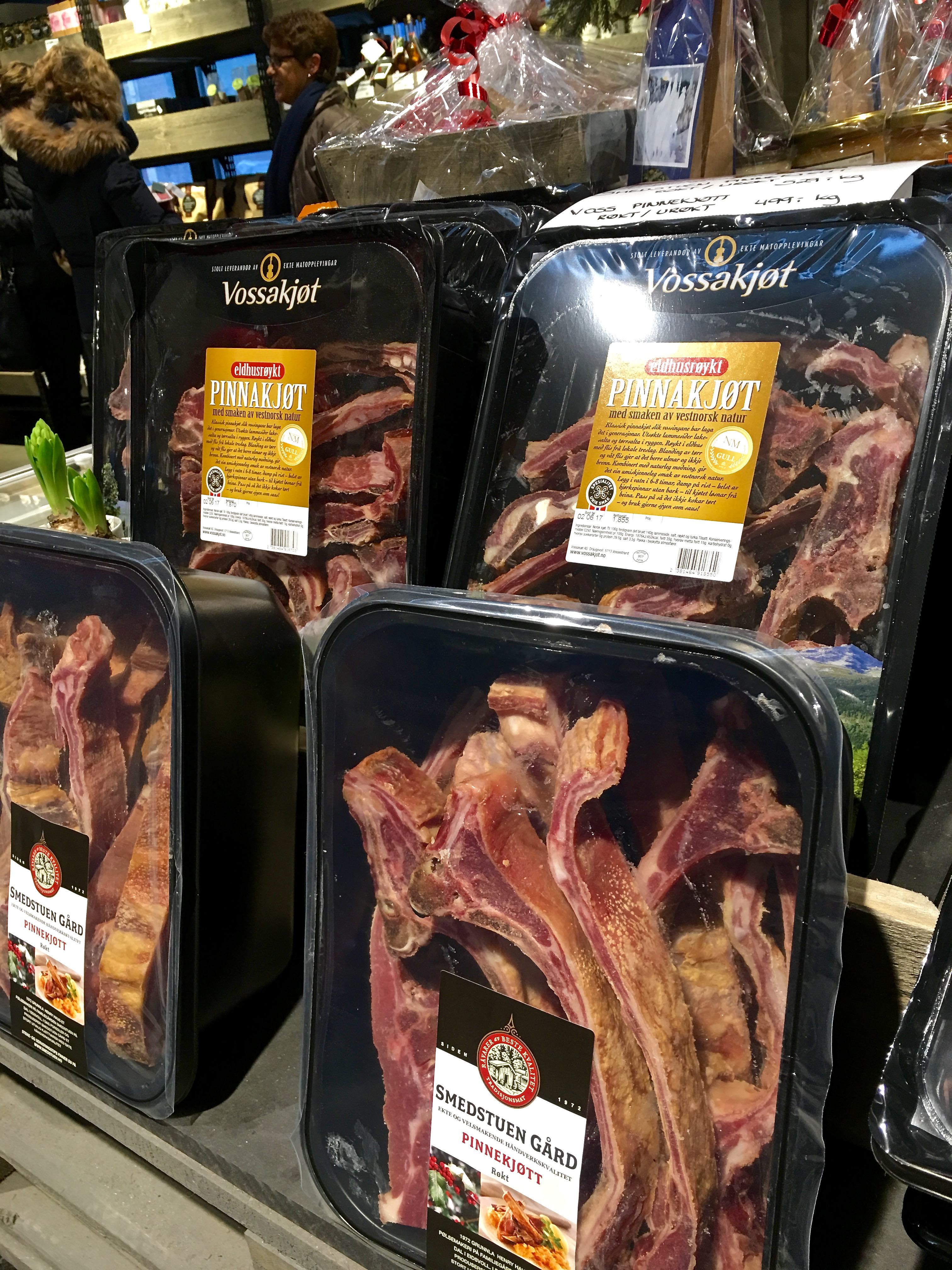 Hadeland’s market had lots of traditional Jul (Christmas) foods on special, including pinnekjøtt. It’s made from salted and dried mutton ribs that are reconstituted by soaking them in water for 30 hours before steaming them over a pot filled with birch sticks. The dish is an ancient one, having been a favorite of the Vikings, who had to find a way to preserve meat for their long voyages. I’ve tried the dish once, and let’s just say that either I had a bad batch, or it’s an acquired taste.