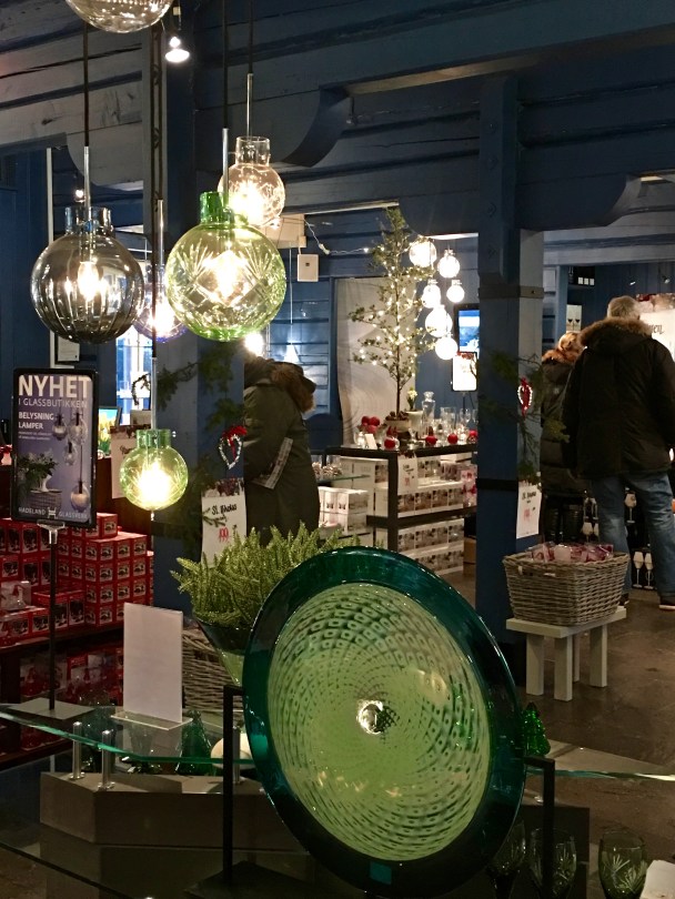 Hadeland’s “firsts” store features incredible hand-blown platters, vases, lighting, and holiday ornaments. (“Seconds” are priced about 50% less.) I think my favorites are the “Krystallkule” lights, which combine the technique of mouth-blowing glass with cutting the incised crystal globes by hand. Four patterns are available, one of which is based on Hadeland’s popular 1913 Marie wine glass series (note the big green globe.) All are designed by Maud Gjeruldsen Bugge, Hadeland’s current Design Director.