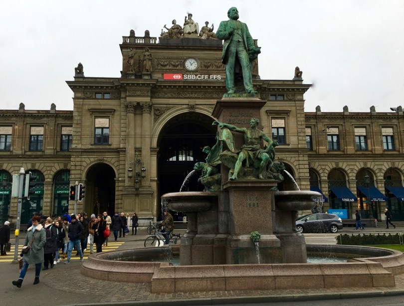 Zürich’s neo-Renaissance Hauptbahnhof is one of the largest and busiest train stations in Europe. The triumphal arch, built in 1871, helped proclaim Zürich as Switzerland’s industrial capital. On the top of the arch, you see the central figure of Helvetia. She’s named after the Celtic Helvetii tribe, the original inhabitants of Switzerland, who were conquered by the Romans. Incidentally, the official title of Switzerland is Confoederatio Helvetica. That’s why the license plates say CH, not SW. (Using the Latin title helps avoid having to string together all the different names for the country in each of the four official languages.)