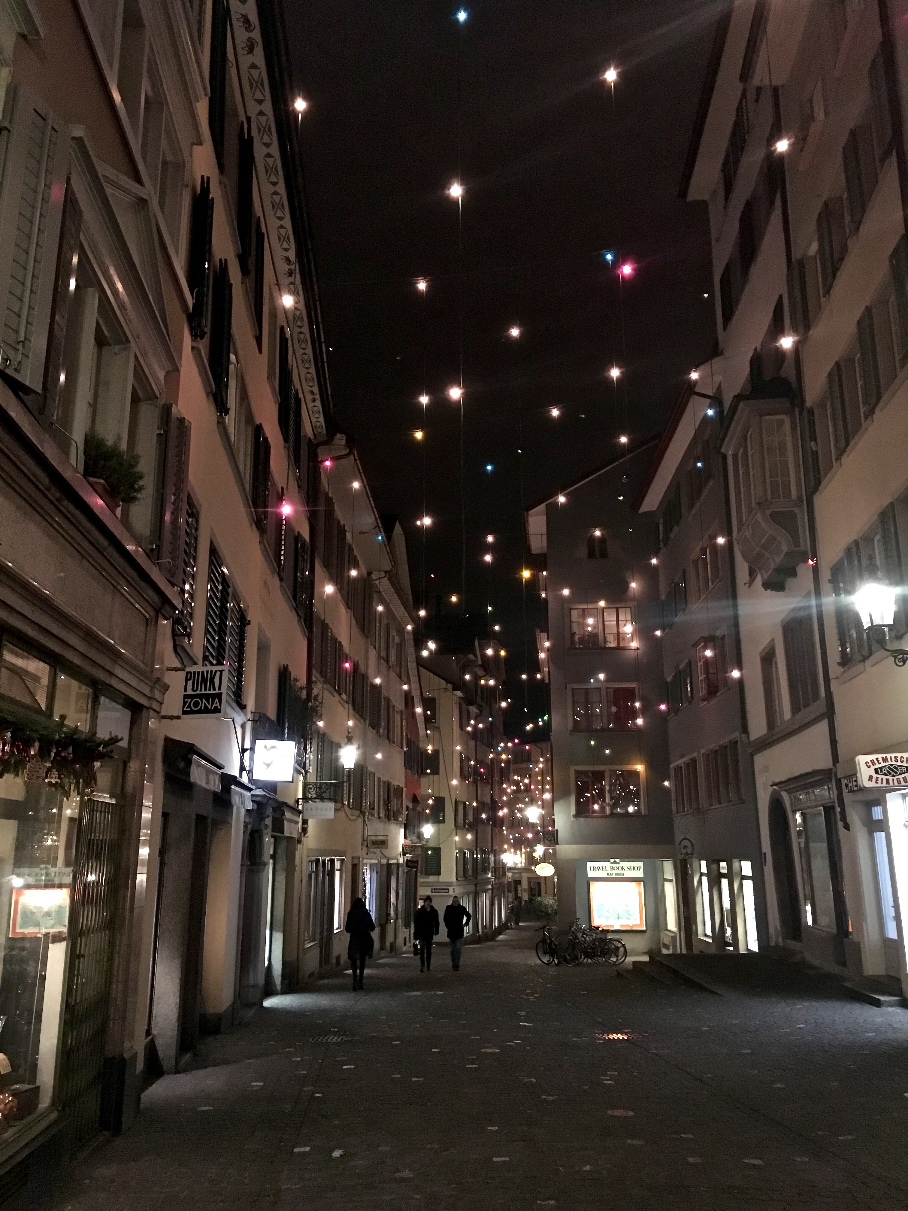 img_7955 January 16, 2017 3024 × 4032 Swiss Christmas in Zürich Zürich has some of the best holiday displays we’ve seen. Strands of lights hung vertically over the street looked like falling stars.