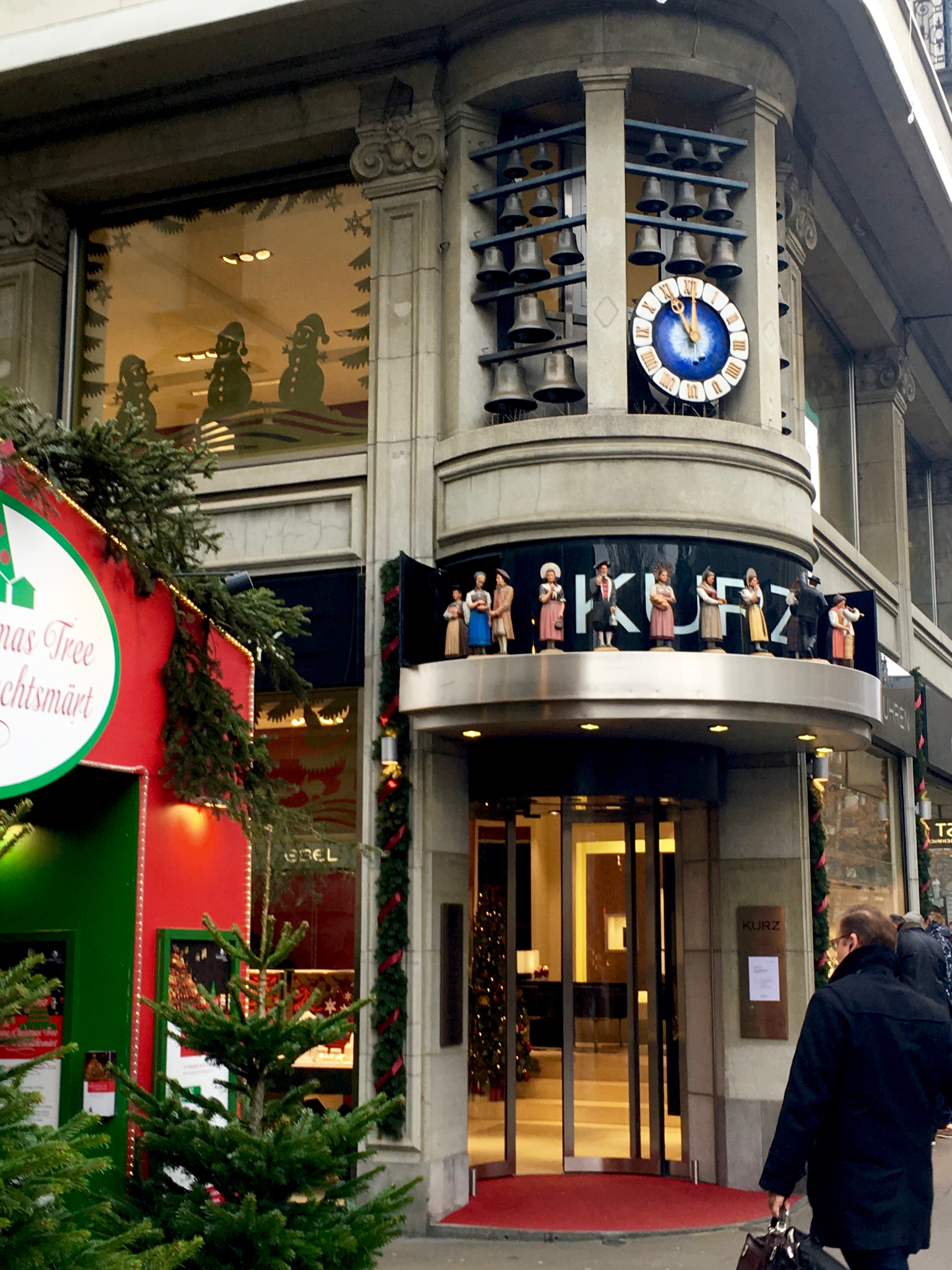 The glockenspiel above Kurz Jewelers was a gift from the original owner to the city of Zürich. The figures represent folk costumes from different regions of Switzerland, and each was hand-carved by woodworkers from Brienz. Every day at 11 a.m. and 4 p.m., the clock strikes, folk tunes chime out, and the figures promenade. Some dance, herd sheep, play an instrument, and even churn butter or clink drinking mugs.