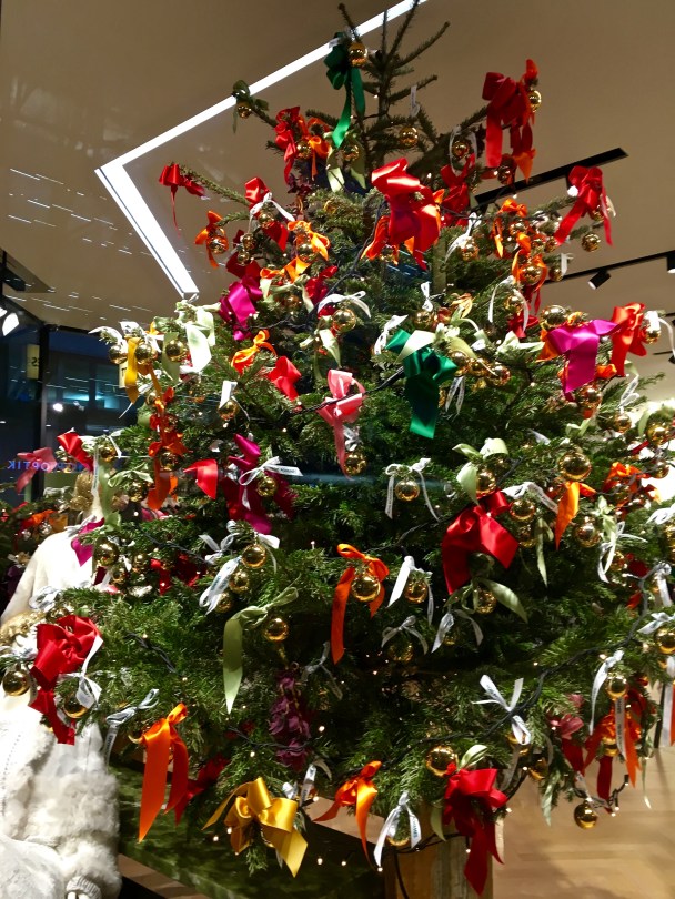 I’m sure we all know by now that the custom of bringing in a live tree and decorating it during the winter solstice is a pagan tradition, converted to Christianity by Germany’s Martin Luther, and popularized by England’s Queen Victoria. I love how the ornaments on this tree are all tied on with ribbons.