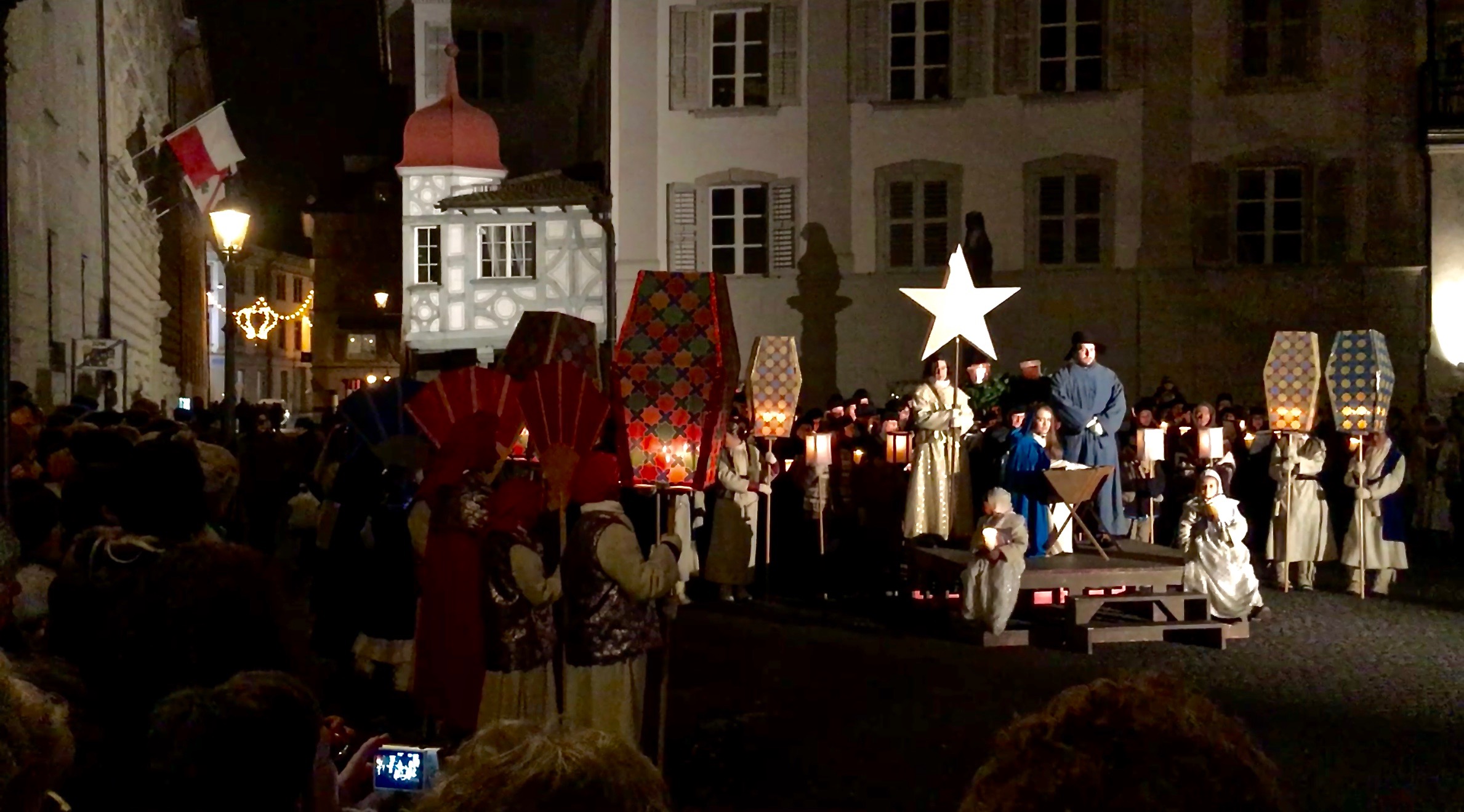 At the head of the line, a choirmaster held an advent wreath aloft. And trailing closely behind was an angel bearing a huge glowing star. The Holy Family followed, with Joseph looking thunderously protective as he escorted a nervous Mary and baby Jesus through the crowded streets.