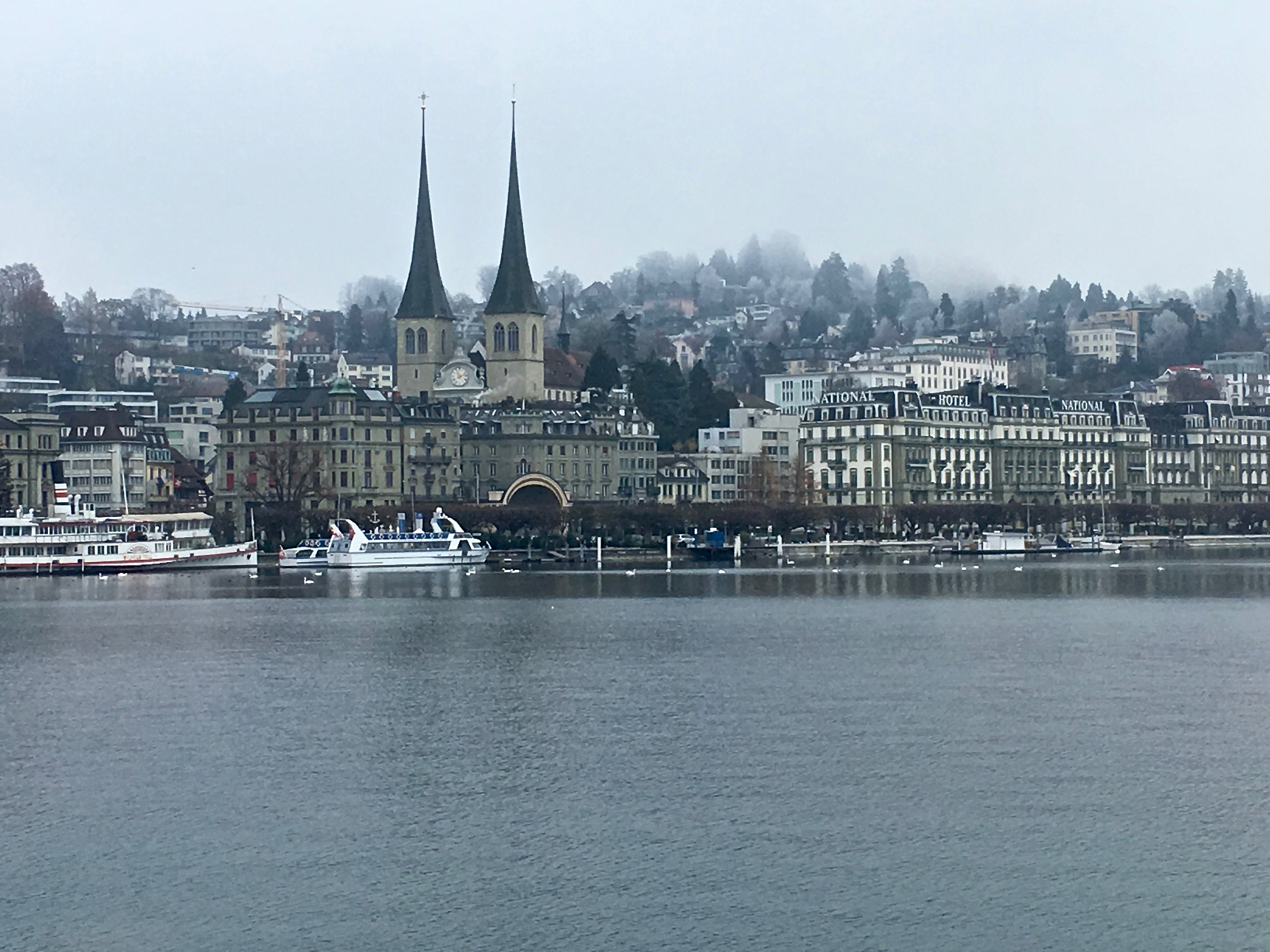 Across from the train station, fancy banks, hotels, and casinos spread out along Lake Luzern while the twin steeples of St. Leodegar preside piously over the scene.