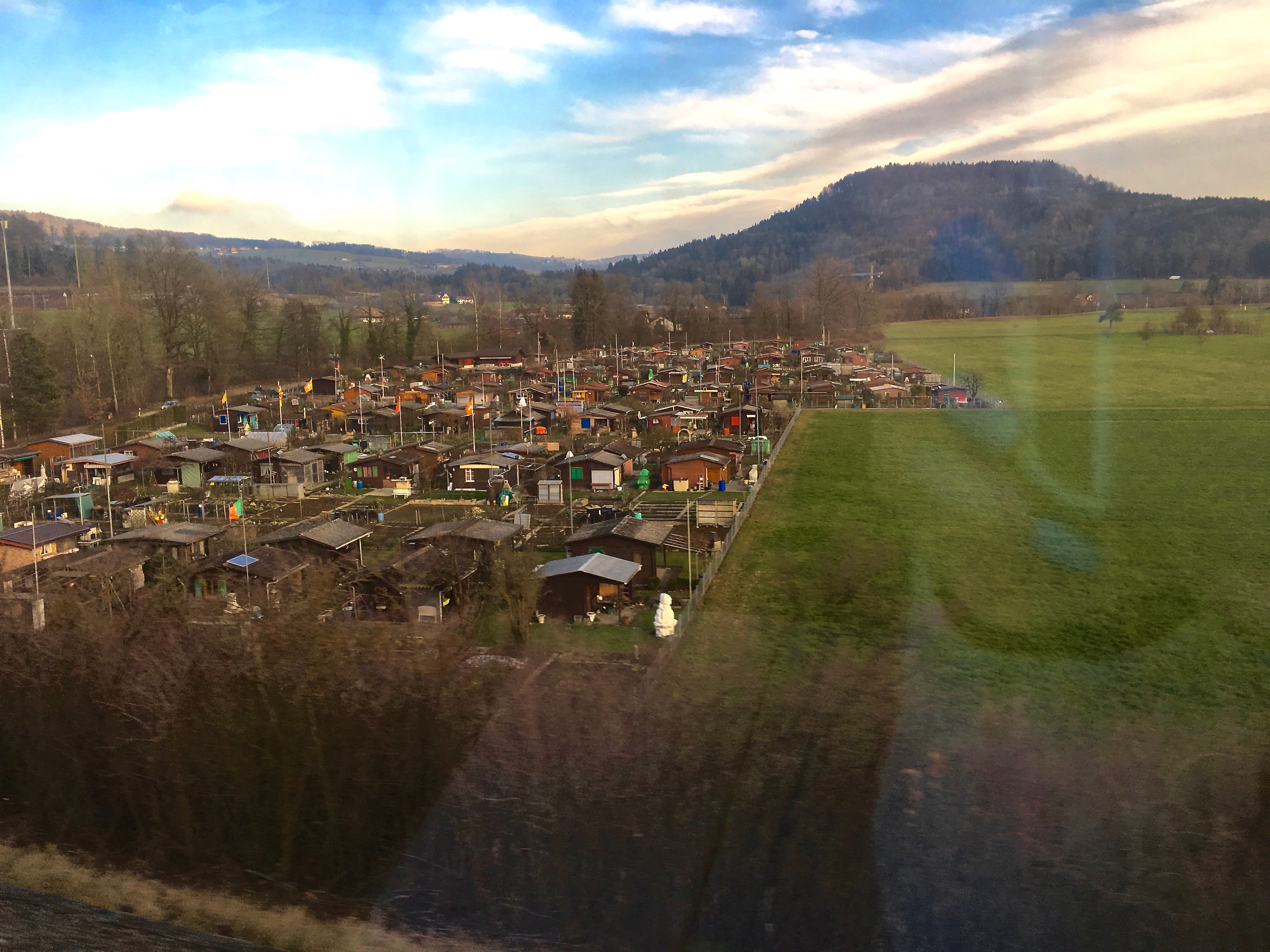 Gypsy camps, we wondered? No, it turns out that these are the mountain cabins, each with its own garden plot, that all citified Swiss escape to in summertime.