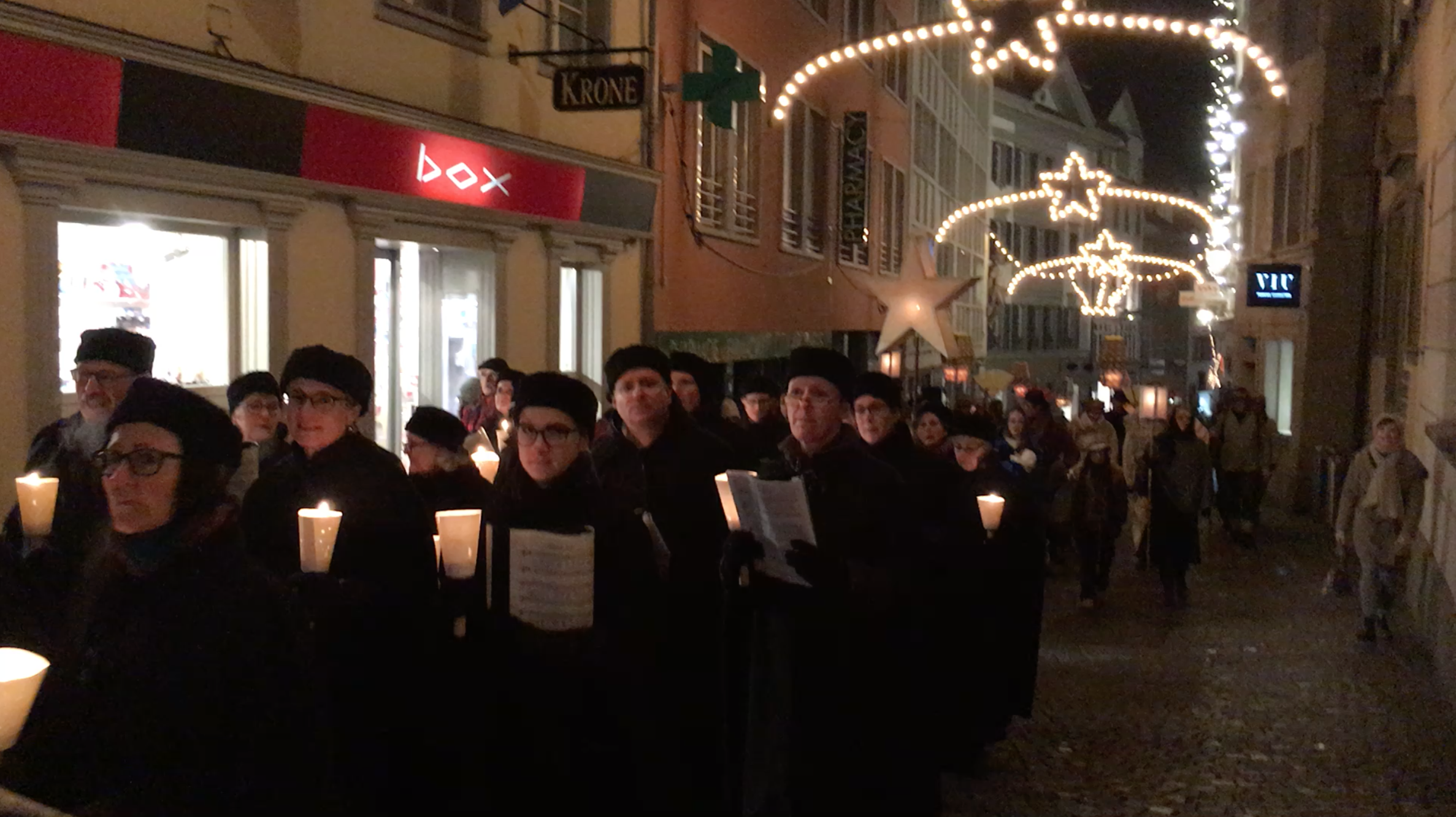We followed the tune and came upon a choir, robed in black cassocks and carrying lanterns in a solemn processional.