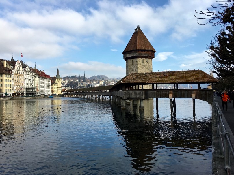 I took this shot the morning we left Luzern — the only day we were able to admire gorgeous Chapel Bridge in all its sunlit Medieval glory. If you look closely, you’ll see that the center of the bridge (the reconstruction) is much lighter than the ends (the remaining original portions). The bridge burned when a speedboat moored beneath it caught fire, although some say the fire was caused by a smouldering cigarette. Needless to say, boats are no longer allowed to tie up to the bridge.