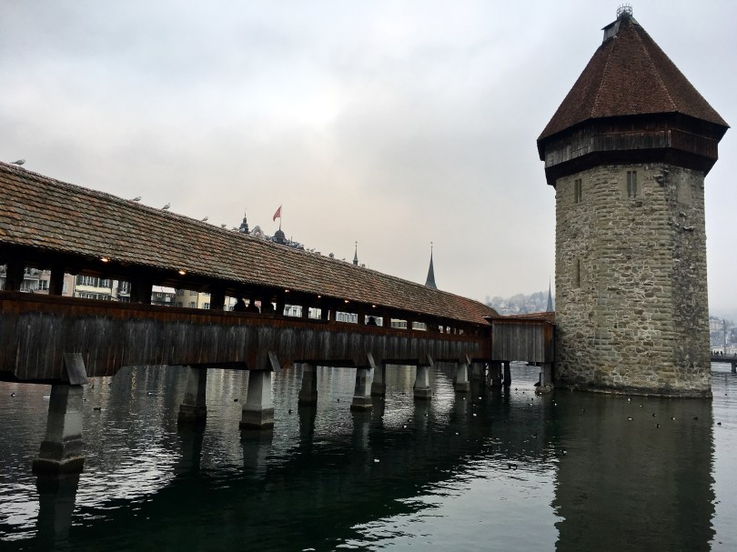 The stone tower, which was built in 1300, remained undamaged by the blaze. It’s known as the Wasserturm (“water tower”), not because it’s a pumping station, but simply because it’s standing in water. Notice that it sits on the side of the bridge that fronts the lake. That’s because enemy attacks usually came from Lake Luzern, which empties into the Reuss River at this point. As part of the Medieval defense system, the tower also acted as a prison and torture chamber.