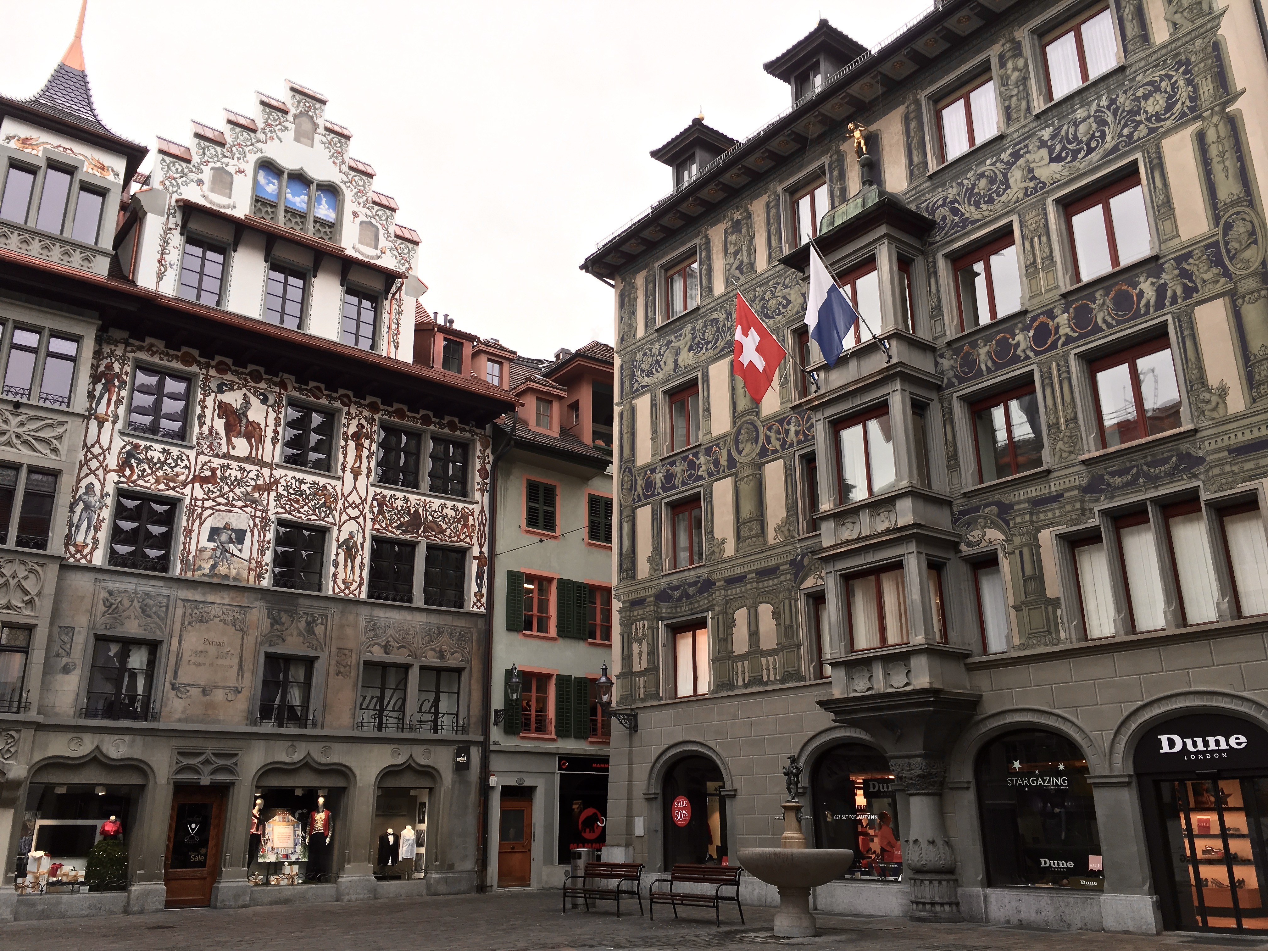 Hirschenplatz (“Deer Plaza,” named after a restaurant that serves deer) hosts two gorgeous buildings. The images on Dornach House (left) celebrate the 400th anniversary of the Swiss over the Germans at the Battle of Dornach in 1499. The building on the right is adorned with a series of huge diamond rings advertising the original owner’s profession (he was a jeweler.)