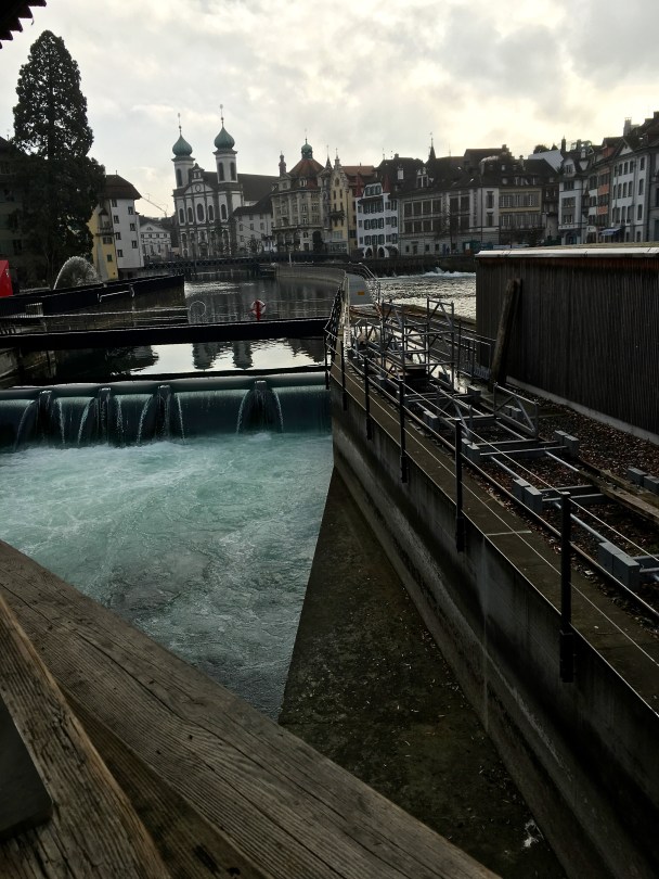 Alongside and beyond the Spreuerbrücke, you can see part of the Ruess River’s weir system. The city of Luzern has the big job of controlling the outflow of water from Lake Luzern down through the Reuss River. The goal is to keep the water at a level where boats can still operate safely on the lake.
