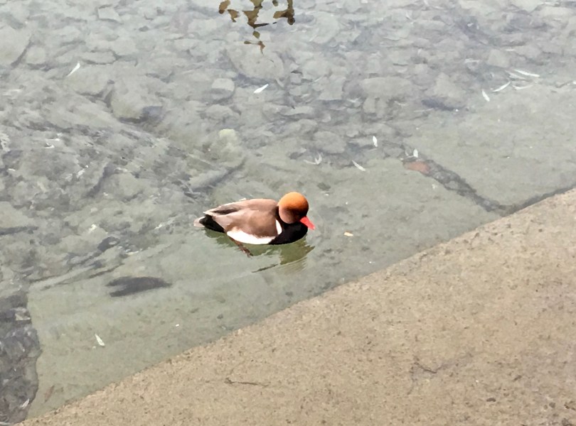 I’m going to bore you for a sec with uber-geeky bird info. A diving duck, the male Red-crested Pochard courts his ladylove by harvesting a beakful of aquatic plants and offering them to her … all while swimming underwater. He can stay submerged for up to 30 seconds.