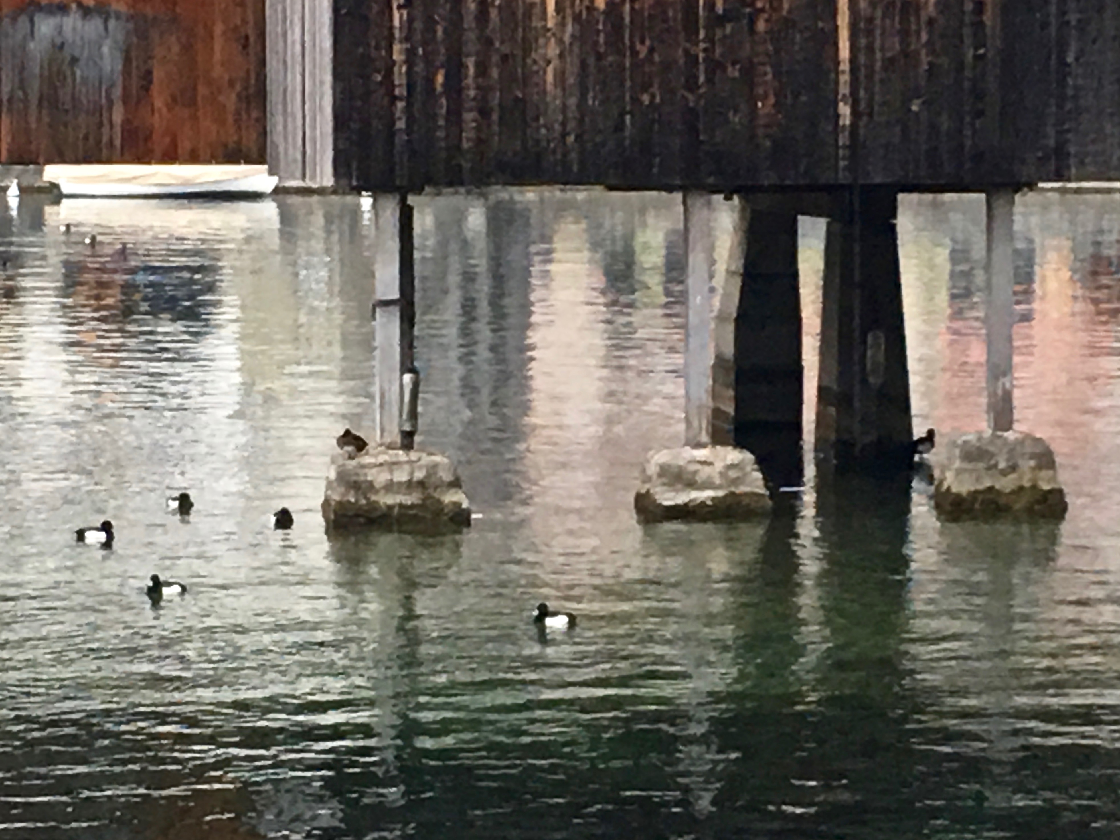 I made the cardinal iPhone error and zoomed in on the birds, which makes this photo look like a paint-by-numbers. But at least you can see the cool blue beak and black-n-white color scheme of the Greater Scaup (Aythya marila) — it’s especially visible in the center bird. The group you see here are all drakes (boys), floating together in what’s known as a “raft.” They share this male-bonding moment after they’ve mated. The men all go off together to molt their feathers, while the women stay at home tending the nest. By the way, these birds can dive 20 feet deep and stay submerged for up to a minute.