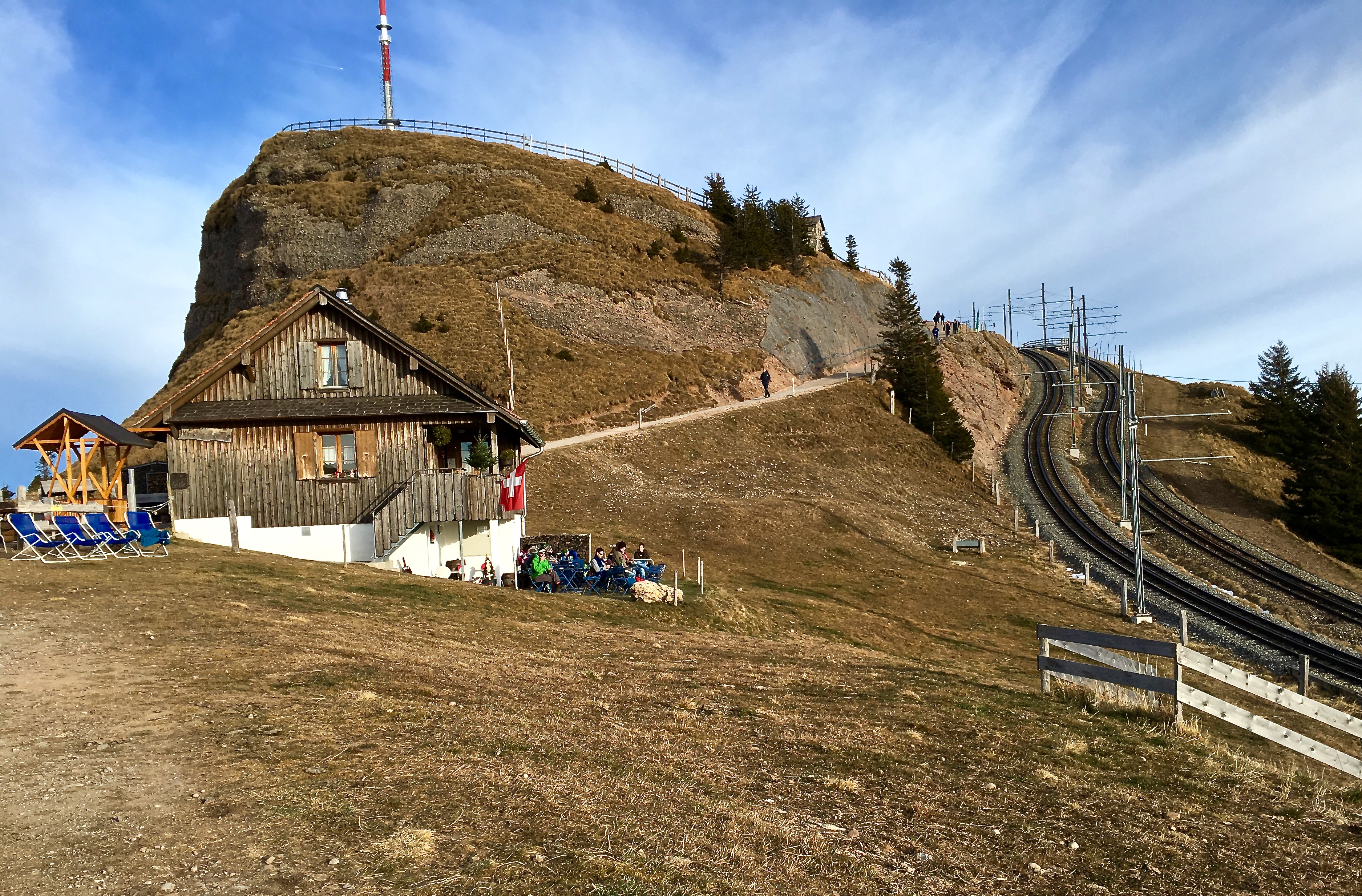 Here’s a view of Rigi’s highpoint. Look closely, and you can see how the mountain got its name. See the layers of pebbly, conglomerate rock in the big hump? “Rigi” means “stripes, rows, or furrows” in High German, a reference to the alternating layers of limestone and sandstone laid down by an ancient sea. Mt. Rigi (and the Alps in general) formed when Africa and the combined continents of Europe and Asia (Eurasia) bumped up against each other. One continental plate slide beneath the other, lifting it up. And voila, mountains! Glaciers aided uplift in shaping the mountains.