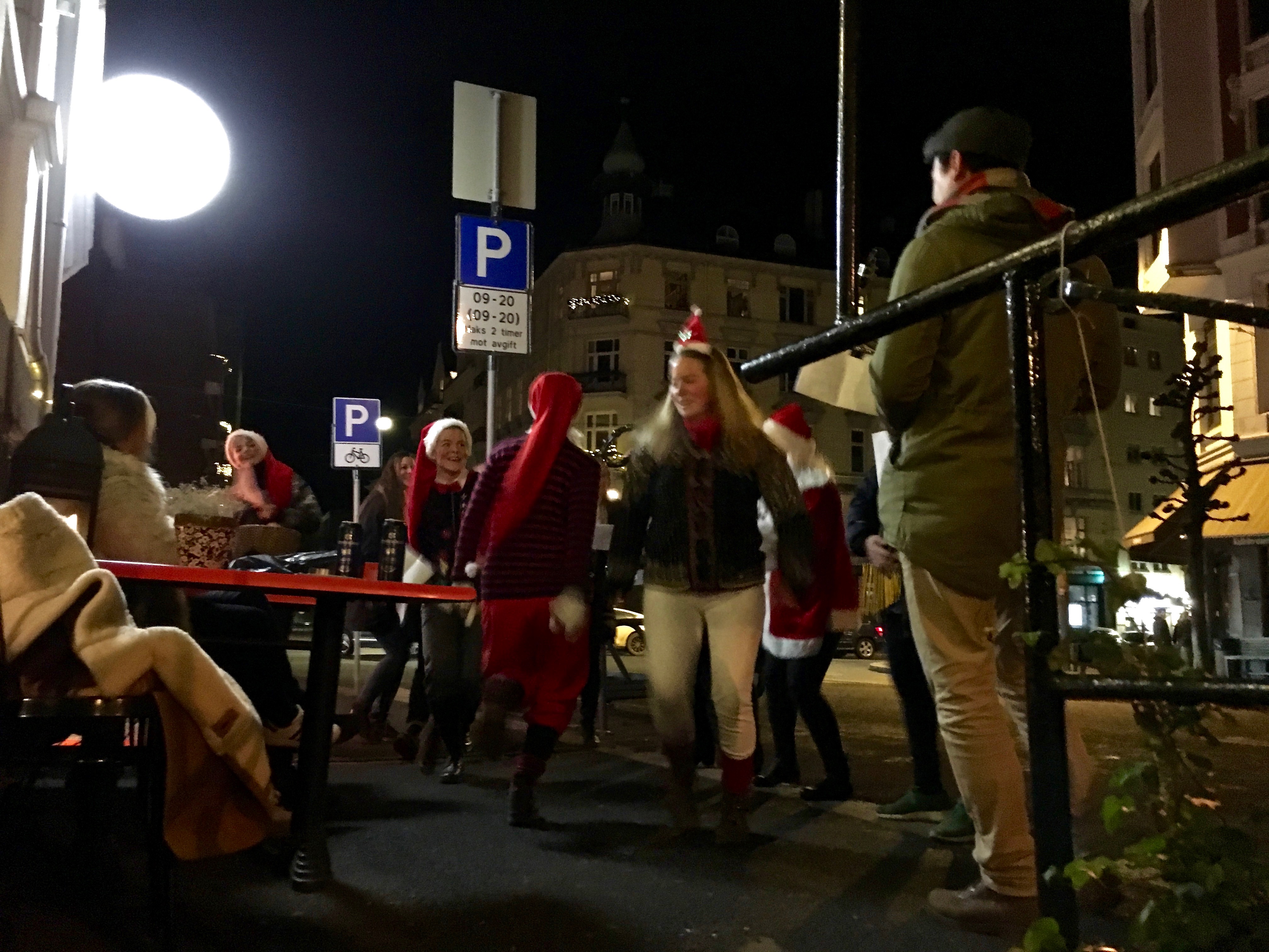 While waiting in line to get into a pizza place, Matthew and I were entertained streetside by a group of folks headed to their Julbord — the company Christmas party. Dancing, singing, playing instruments, and reciting poetry are pretty common activities before, during, and after a Julbord (literally translated, it means “Christmas Table”).