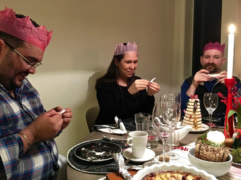 The almond-flavored Kransekake (“wreath cake”) comes with candies and British crackers pinned to it. So we played the traditional game of snapping open the crackers with a communal tug, then donning the crowns and reading the jokes hidden inside. Only one problem. The jokes were in Norwegian, so we had to do some creative translating.