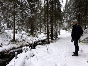 Matthew stands along one of the wider paths marked both blue and red for hikers and skiers.