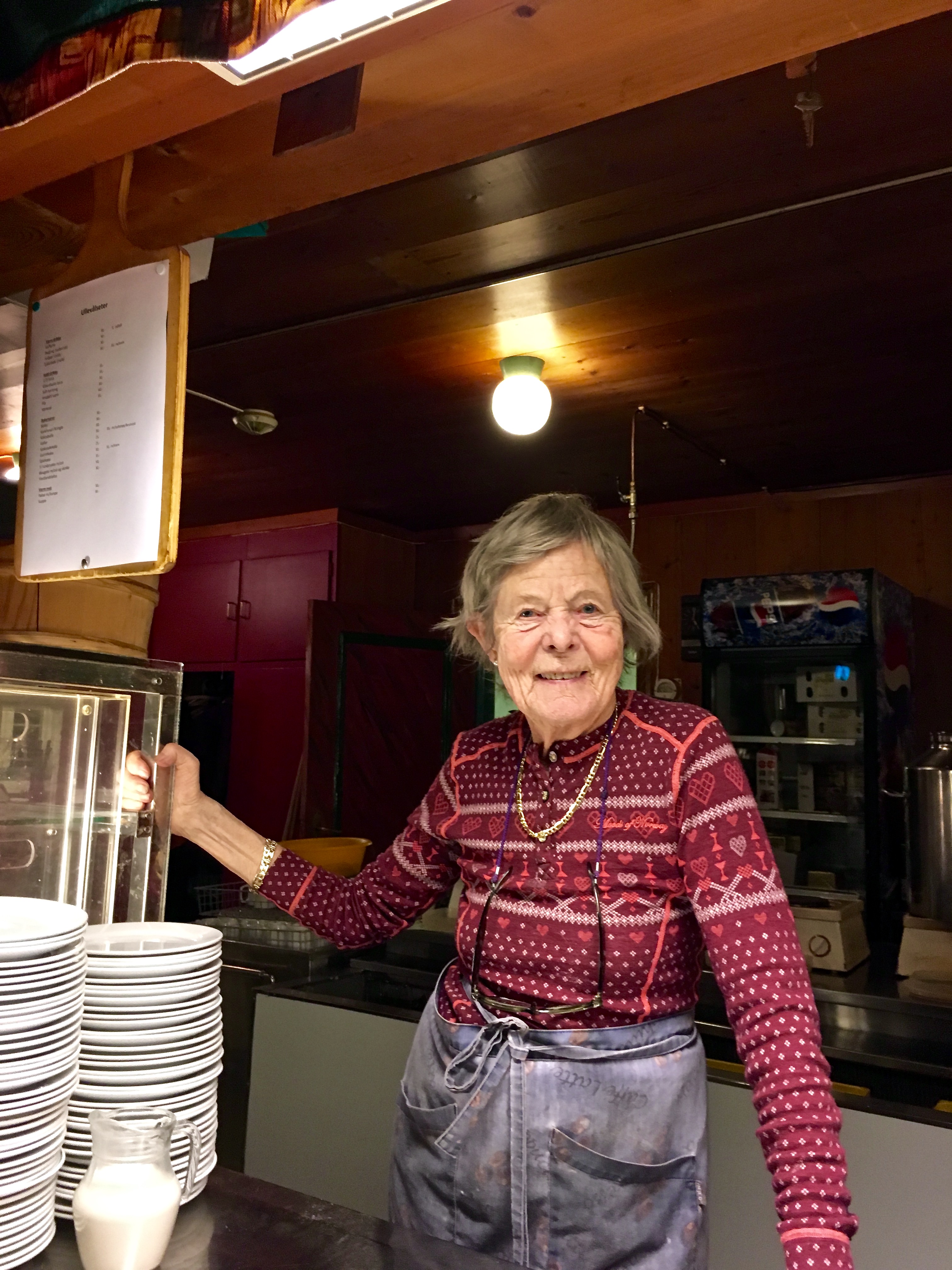 The girl behind the counter said, “The owner who hosted him is here right now. Would you like to talk to her?” Of course I said yes, and soon a smiling older lady in an apron and Norwegian ski sweater popped out of the back room to greet us.