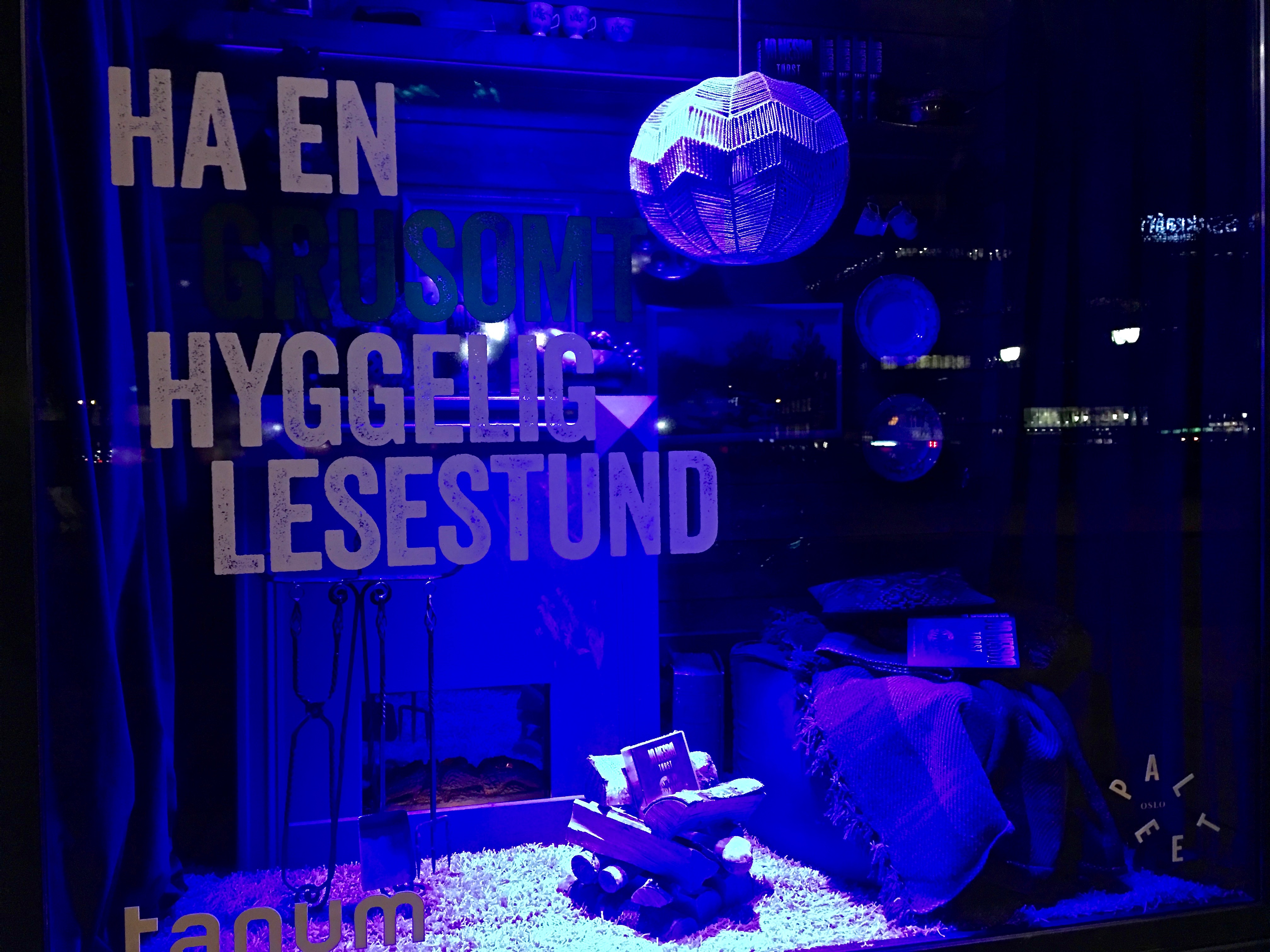 IMG_0324 April 16, 2017 4032 × 3024 An Easter Postcard from Oslo This window says “Ha en grustomt hyggelig lesestund” (Have a cruelly enjoyable reading time.)