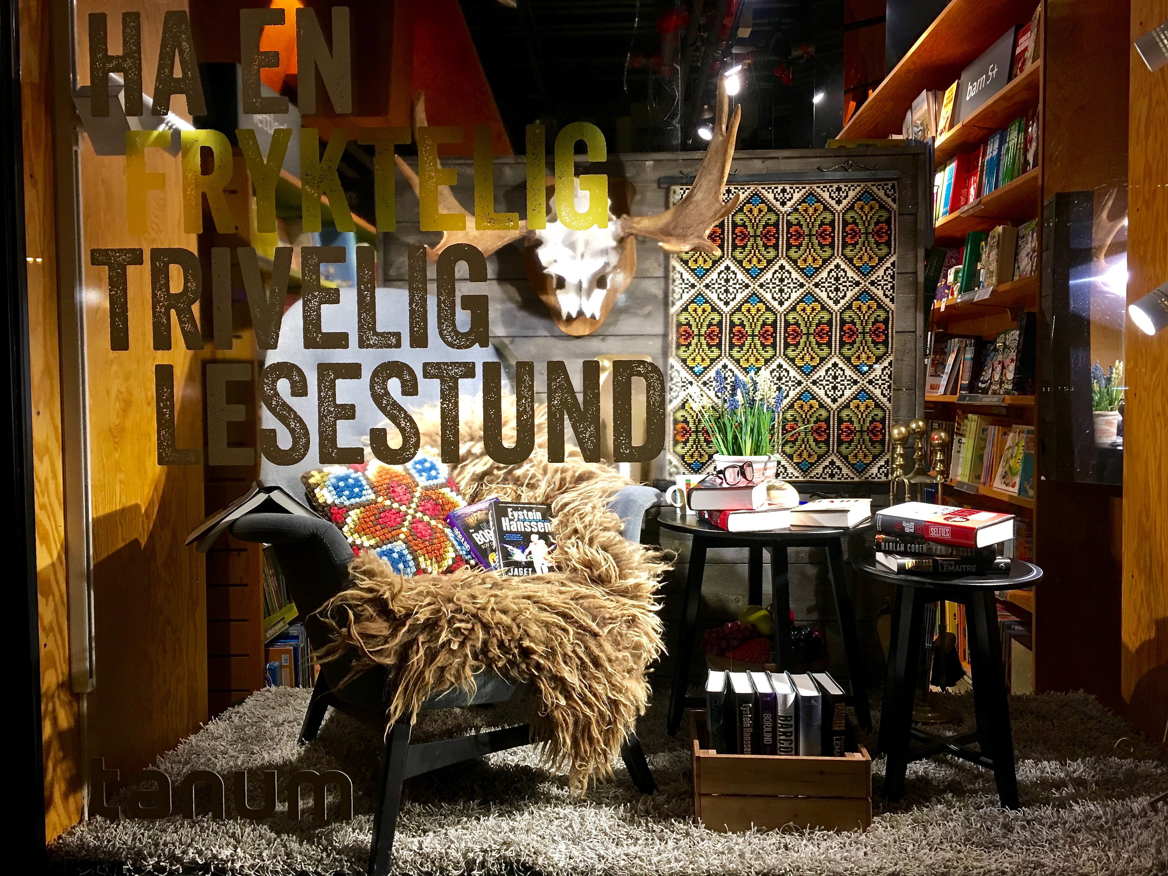 Tanum Bookstore’s window says, “Ha en fryktelig trivelig lesestund” (Have a horribly pleasant reading time.) So to explain the theme, Norwegians typically hole up in their hyttes (mountain huts) over the holiday to read their crime novels. All three Tanum windows show what you can typically expect of a hytte’s interior: wood-paneled walls, lotsa needlepoint and woven wall hangings, a roaring fire, sheepskin pelts, candlelight, moose antlers, paintings of pastoral Norway, and Danish modern furniture. All the elements of “hyggelig” or “koselig” — that much-desired quality of hominess that transcends the meaning of “cozy.”