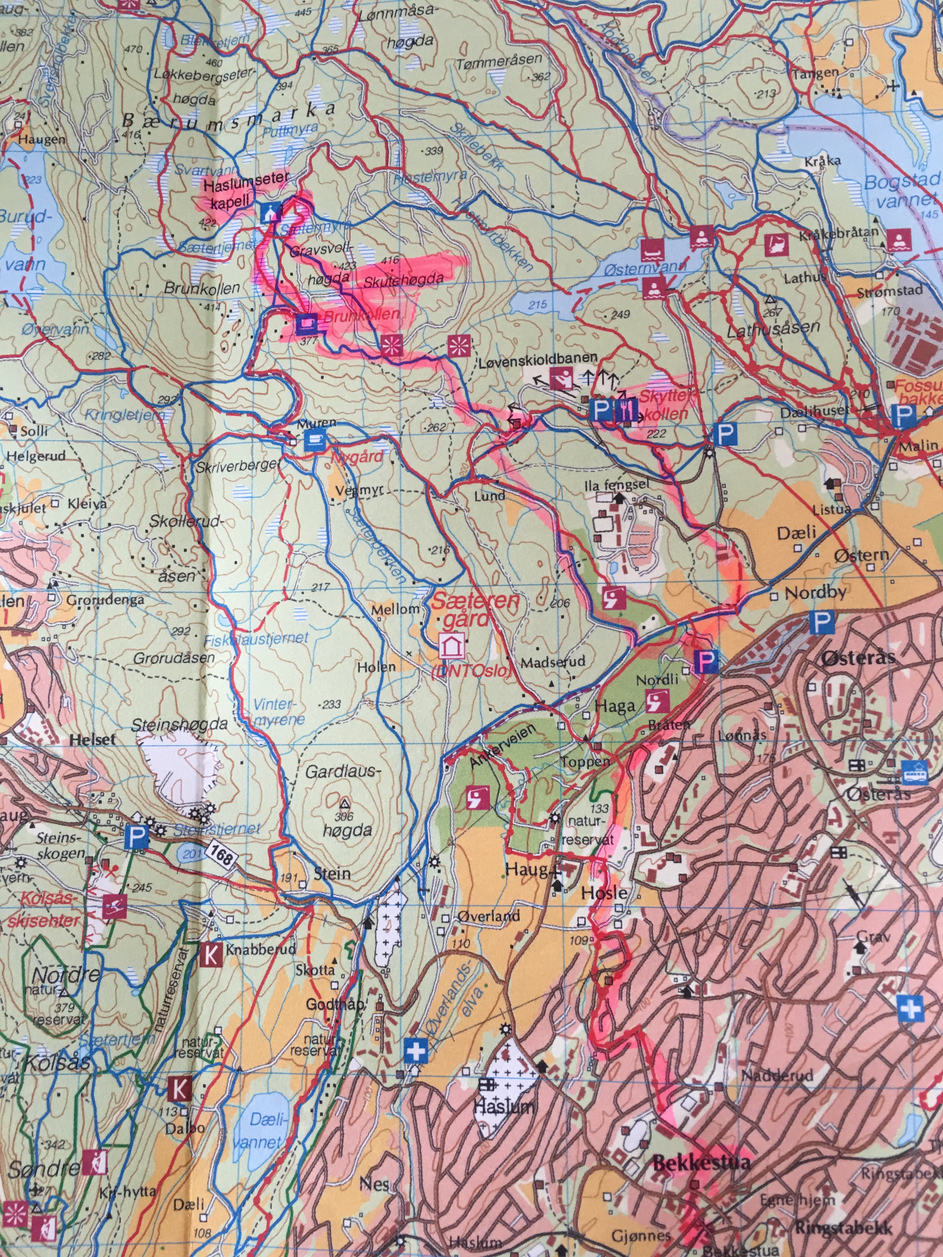 We combed the DNT (Norwegian Trekking Association) map for a new yet nearby footpath and finally decided upon one in the Baerumsmarka (the forest that surrounds the neighborhood of Baerum).