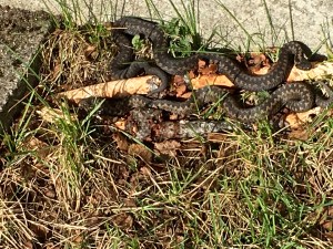 Sure enough, a long European adder (Vipera berus) sat curled in the sunshine. We crept up on it for a closer look, and it immediately squirmed into its hidey hole, a chink in the concrete.
